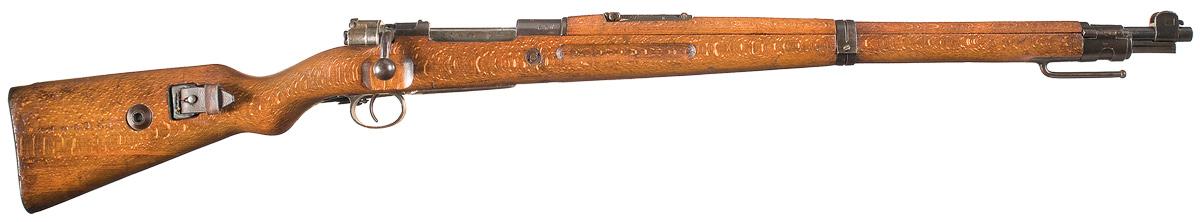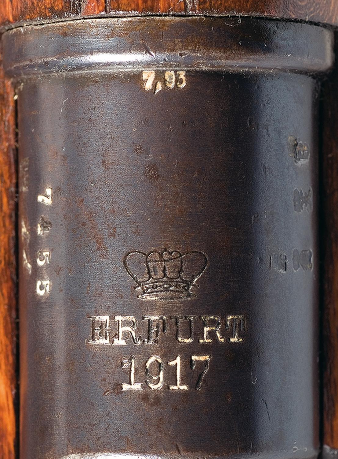 This is a WWI production Model 98a carbine as manufactured by the Erfurt Arsenal. The top of the receiver ring is marked "crown / ERFURT / 1917". The right side is marked with three "imperial arsenal" acceptance proofs and the left side is marked with the serial number and "Imperial eagle". The left side wall is marked "KAR 98.". The floor plate and assembly are also marked with the "Imperial" proofs. All visible numbers match. Shrouded front sight and tangent rear sight graduated to 200 meters. Mounted with a full length pistol grip stock and hand guard with Imperial proof marks on the right side buttstock and on the wrist. Complete with a pebble grain sling. Matching serialized specimens are seldom encountered like this example.