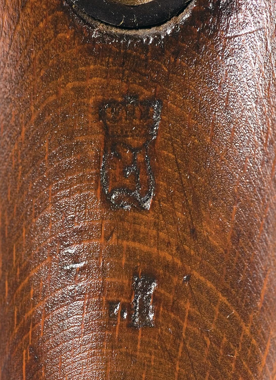 Condition: Very fine. The carbine retains 70% faded original finish with wear on the muzzle and smooth brown patina on the barrel bands, floor plate and trigger guard. There are a couple of minor scratches and dings, and mild high edge wear on the receiver. The wood is also very fine with the exception of a small gouge present on the comb, and overall some minor nicks and handling marks. The sling is very good. The markings are crisp and clear. The action is excellent.