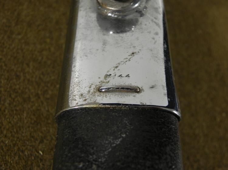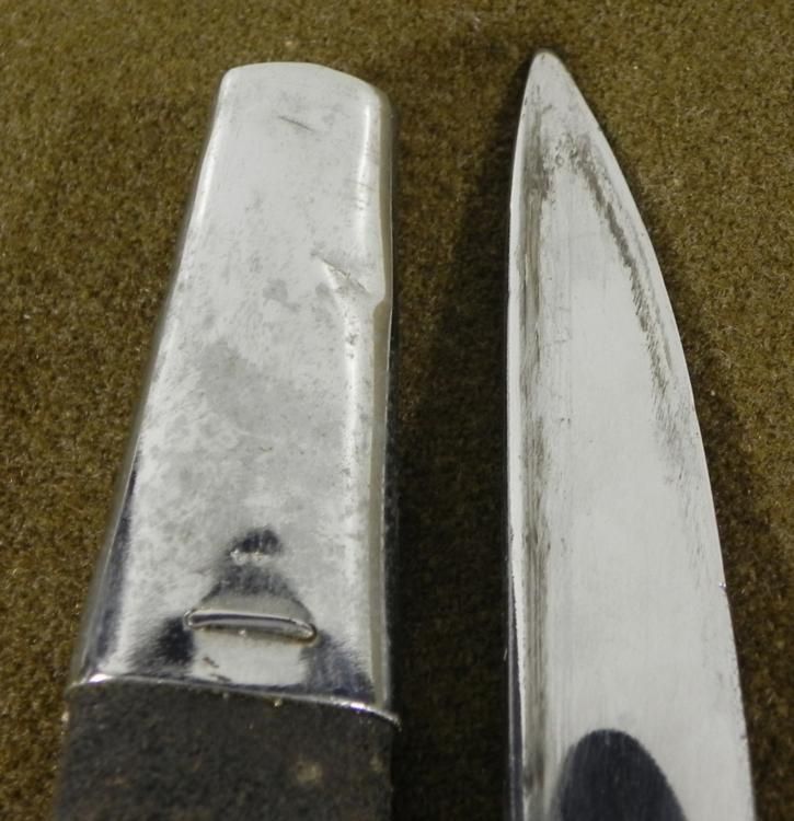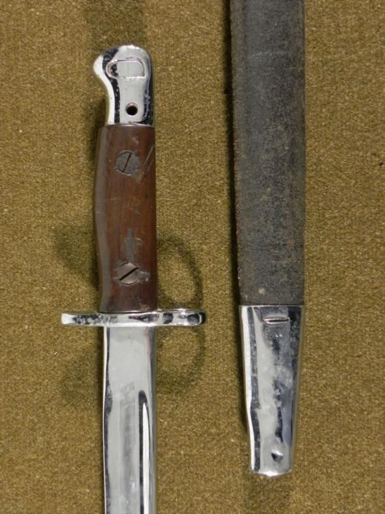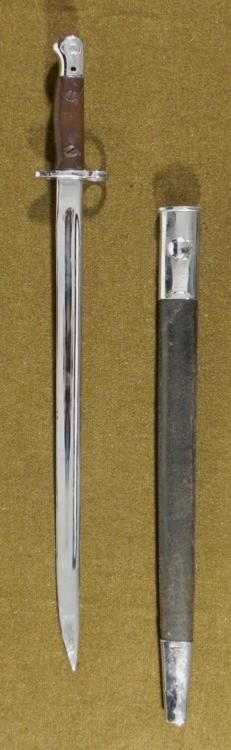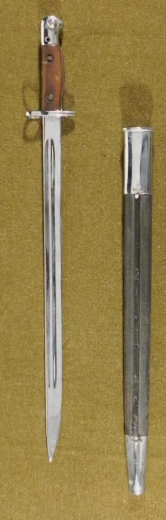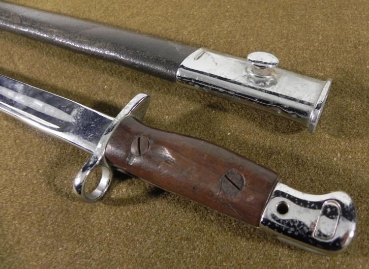 WWI MAUSER BAYONET-WOOD GRIPS-17"" BLADE-LEATHER SCABBARD-CHROMED"HARDWARESTAMPED M/44 ON SCABBARD TOP FURNITURE