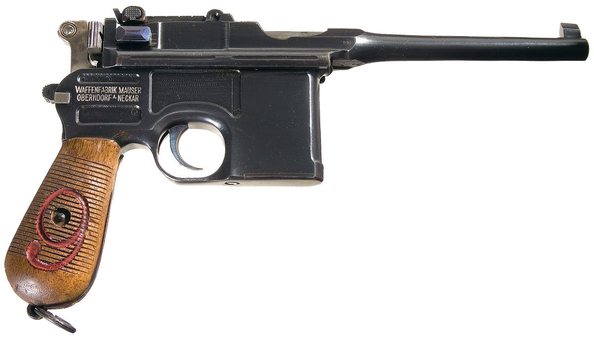 This is an excellent example of a Mauser Contract, "Red 9"semi-automatic pistol. The trigger, safety, rear sight elevation bar and extractor have a brilliant niter blue finish. The grips have a large "9" filled with red paint burned into both sides. The right side of the pistol receiver is marked: "WAFFENFABRIK MAUSER / OBERNDORF A NECKAR.". The top of the barrel chamber is marked: "WAFFENFABRIK / MAUSER / OBERNDORF A/N." There is an imperial eagle proof stamped on the front of the magazine. All components have matching serial numbers including the grips. The Mauser "crown / U" definitive proof mark is located on the upper left side of the receiver on the flat below the serial number and on top left side of the bolt.