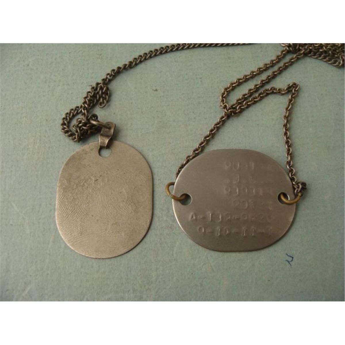 OFFERED HERE ARE A PAIR OF WWI U.S. DOGTAGS FROM THIS CAREER NAVY LT COMMANDER WITH CHAIN. * "THIS ITEM IS PART OF THE PERSONAL EFFECTS AND MEMENTOS OF USN LIEUT THAT SERVED IN THE NAVY FROM WWI THROUGH WWII (1909-1946). ENLISTED IN 1909 IN THE 1ST DIV ILLINOIS NAVAL RESERVE. CALLED TO ACTIVE SERVICE IN 1917 AND ASSIGNED TO THE U.S.S. SALEM & SHORTLT REASSIGNED TO THE U.S.S. INDIANA WHERE HE BECAME EXECUTIVE NAVIGATION OFFICER. DURING THE EARLY YEARS OF WWII HE COMMANDED THE ANTI-AIRCRAFT TRAINING CENTER AT GREAT LAKES, ILLINOIS. PROVENANCE AND PHOTO WILL BE PROVIDED TO THE WINNING BIDDER." *