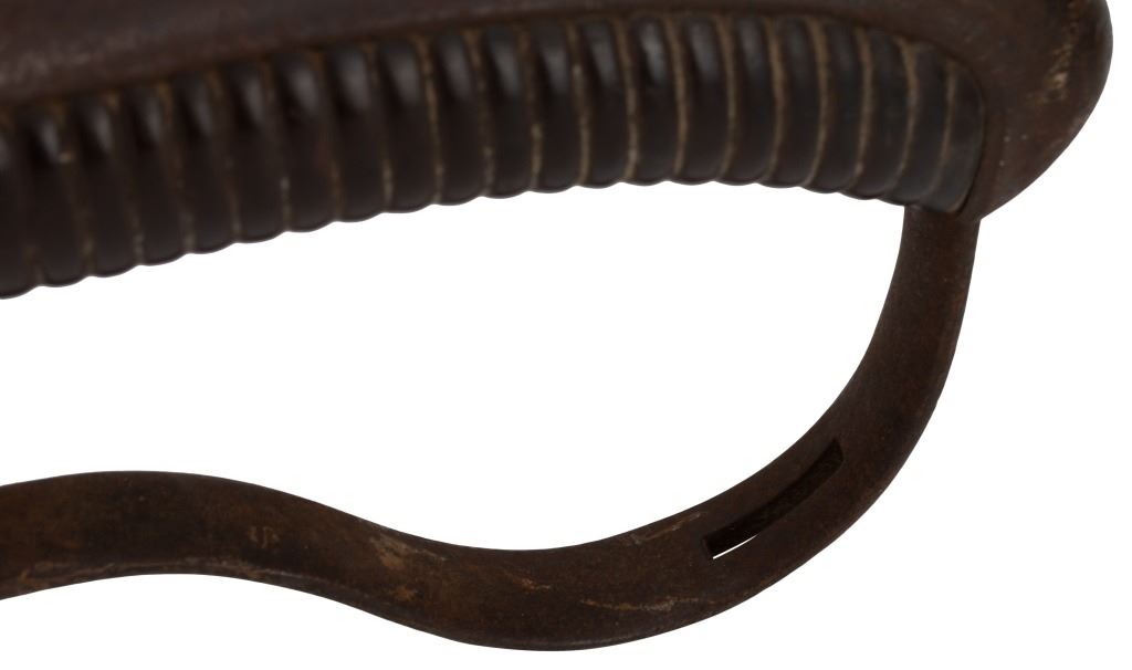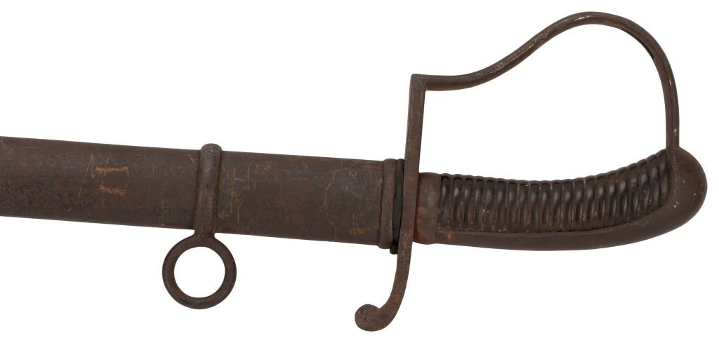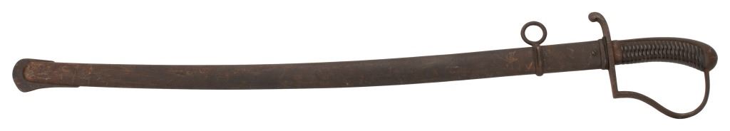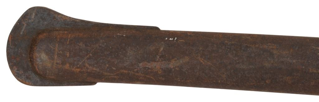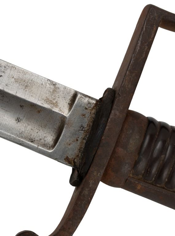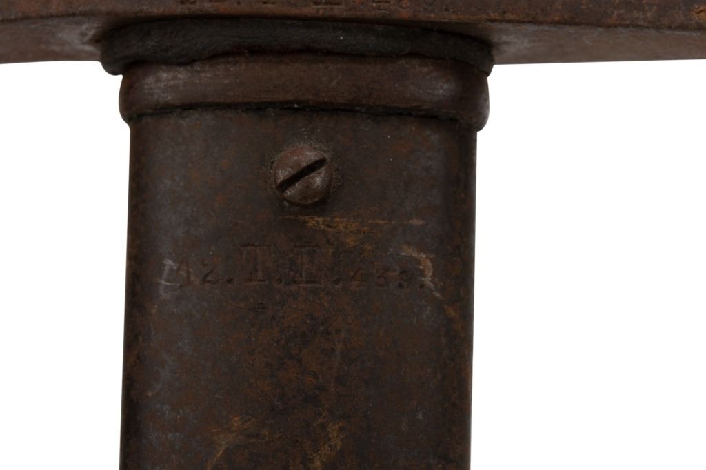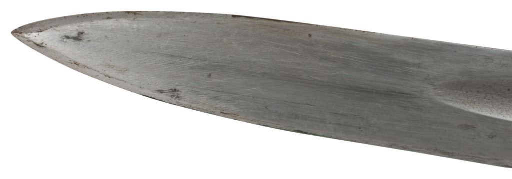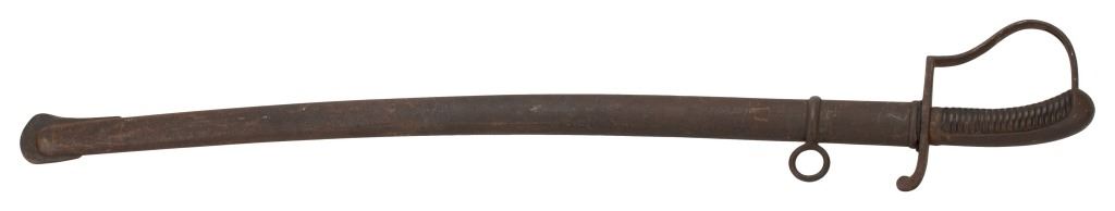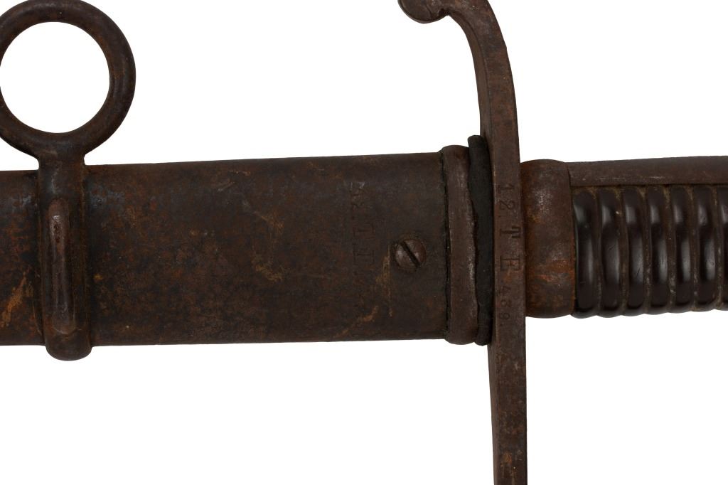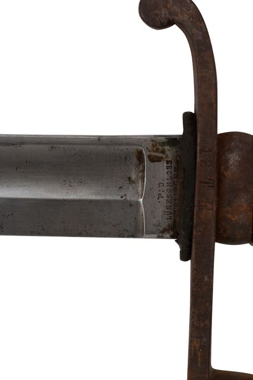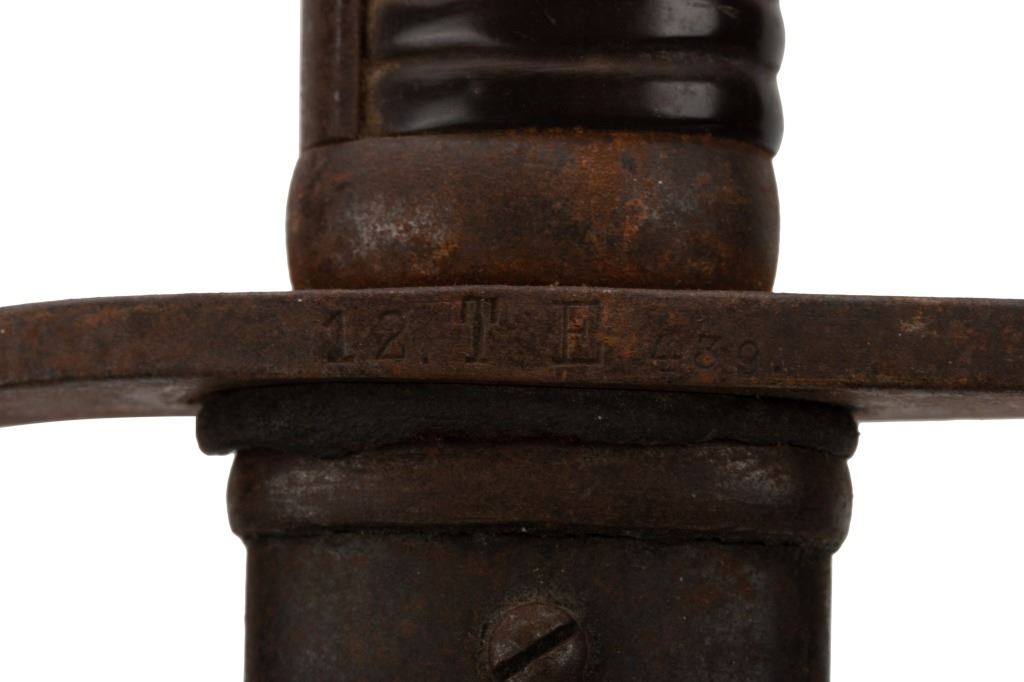 Item/Description: World War I sword made by Peter D Luneschloss. Officer's Sword with metal scabbard. Ricasso marked P.D. Luneschloss Solingen. Opposite side is marked with a stylized 'A'. Guard edge and scabbard marked: 12. T.E. 439. Black celluloid grip.