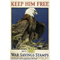 <B>Keep Him Free Buy W.S.S. (Ketterlinus, 1918)</B></I> WW I Poster (20" X 30"). This image of a ferocious eagle is by Charles Livingston Bull (1874 - 1932), the premiere American wildlife artist of his time. He started out as a taxidermist in his hometown of Rochester, N.Y. and eventually became a nationally recognized expert on animal anatomy. He started his illustration career in New York in 1901. He illustrated over 130 books, did murals for public buildings and covers for hundreds of magazines. Fine/Very Fine condition.