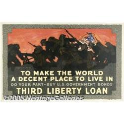 <B>To Make the World a Decent Place to Live - Buy U.S. Government Bonds: Third Liberty Loan (Niagara Litho Co., 1918)</B></I> WWI Poster (36" X 56"). Depicted: Allied troops, at and behind a gun emplacement, against a red sky; a U.S. flag flies in the background. This dramatic large format poster, measuring nearly five feet across, is designed by Minneapolis born, Herbert Paus (1880 - 1946). His most noted work is famed advertising campaigns for Victor Records and Hart, Schaffner and Marx. He designed over 50 covers for Popular Science Monthly and Coilliers. Very Fine+ condition on Linen.
