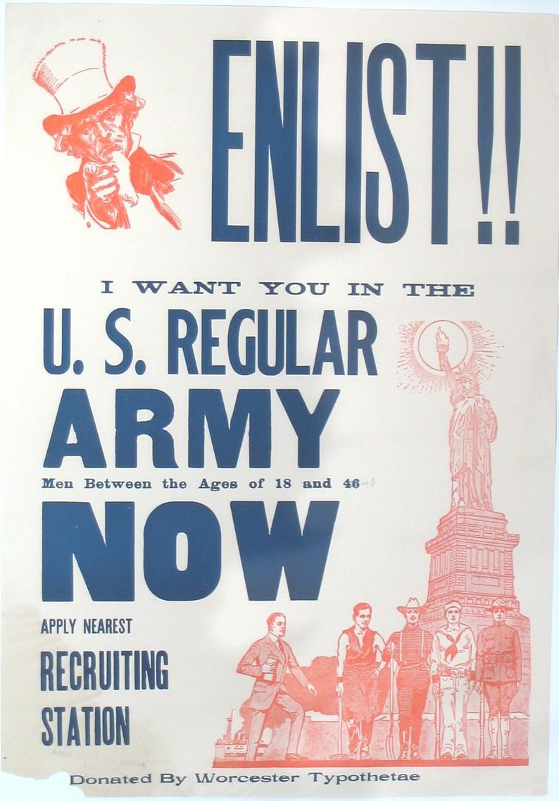 1917 WWI poster with sketch of Uncle Sam uttering the slogan ''I Want You in the U.S. Regular Army, Men Between the Ages of 18 and 46…'' Image measures 14'' x 20''. Chip at lower left bottom corner. Archival tape mend on verso. Ultramarine blue text. Illustration in red ink of military volunteers in front of the Statue of Liberty. Also features Uncle Sam pointing at reader. Overall, excellent condition.
