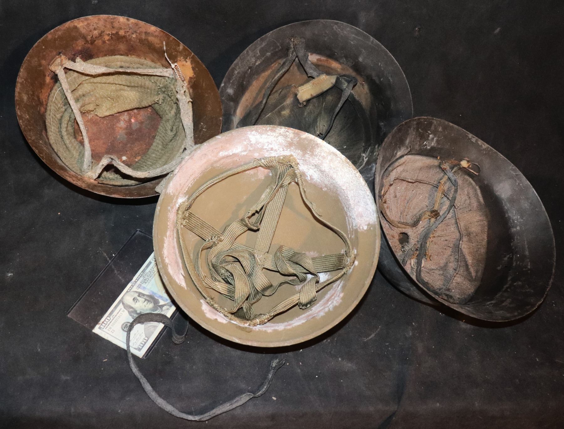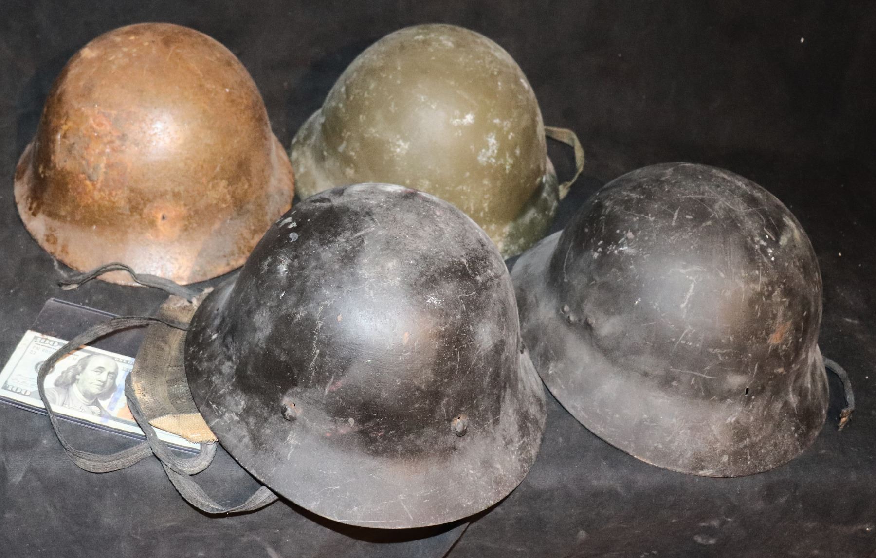 Though used as props at some point I believe these to be authentic helmets. WWI is my guess but could be WWII!