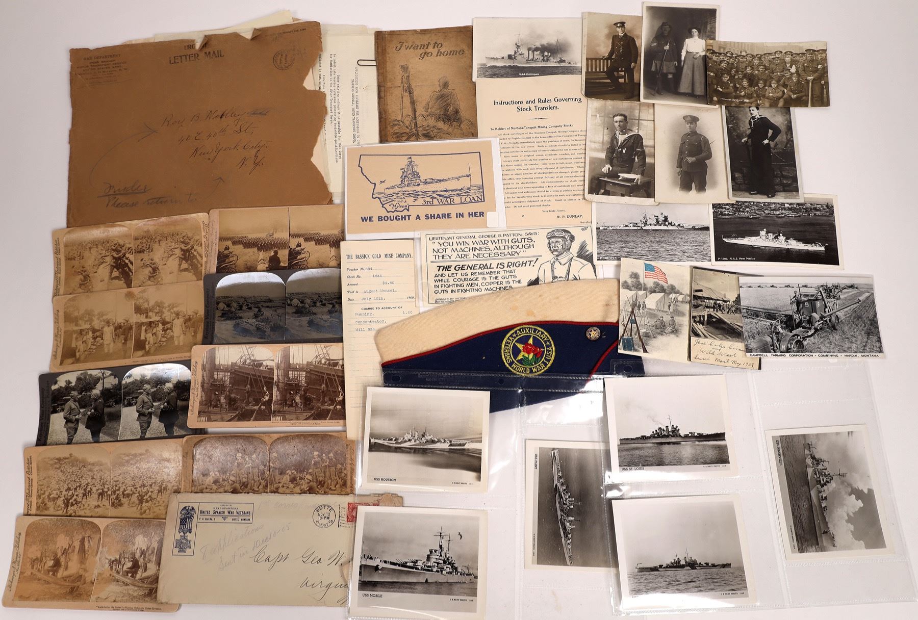 lot of 29. 1. Nine RPC's, B/W, not postmarked. Divided and undivided. One marked "U.S.A. Post Card" w/British sailor. ground view: farming combine (1900c), British soldiers group, Scottish soldier w/woman, British Officer (slight damage), USS New Mexico and USS Mississippi underway. 2. Photo's, B/W: Warships: USS Richard, Nashville, Denver, St. Louis, Flint, Houston, Mobile. 1939 Jene Coles Circus setting up tent. 3. Nine 1899-1914 Stereopticon slides of war: Cuban invasion, Philippines, South America, Havana Maine wreck, Marshal Joffre and Gen. Pershing meeting, Gallipoli Landing 4. WWI Vet Aux hat, small booklet "I Want To Go Home", poems by soldiers WWI (taped binding, frayed edges, fragile). 5. 1918 War Dept. record of Roy B Wooley as a civilian applying for Captain position in the new Motor Transport Service. Letters of correspondence, applications and approval (this does show signs of usage). 6. Bassick Gold Mine 1900c receipt for supplies. Envelope United Spanish War Veterans postmarked 1905 Montana, no correspondence. Instruction sheet to Montana-Tonopah mining stockholders. State: City: Date:1898-1918 Provenance: Stuart Mackenzie Montana Ephemera Collection