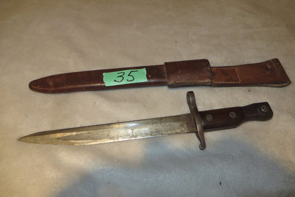 WWI Ross Bayonet c/w leather sheath sharp point RCA, LOB, Ross rifle Quebec