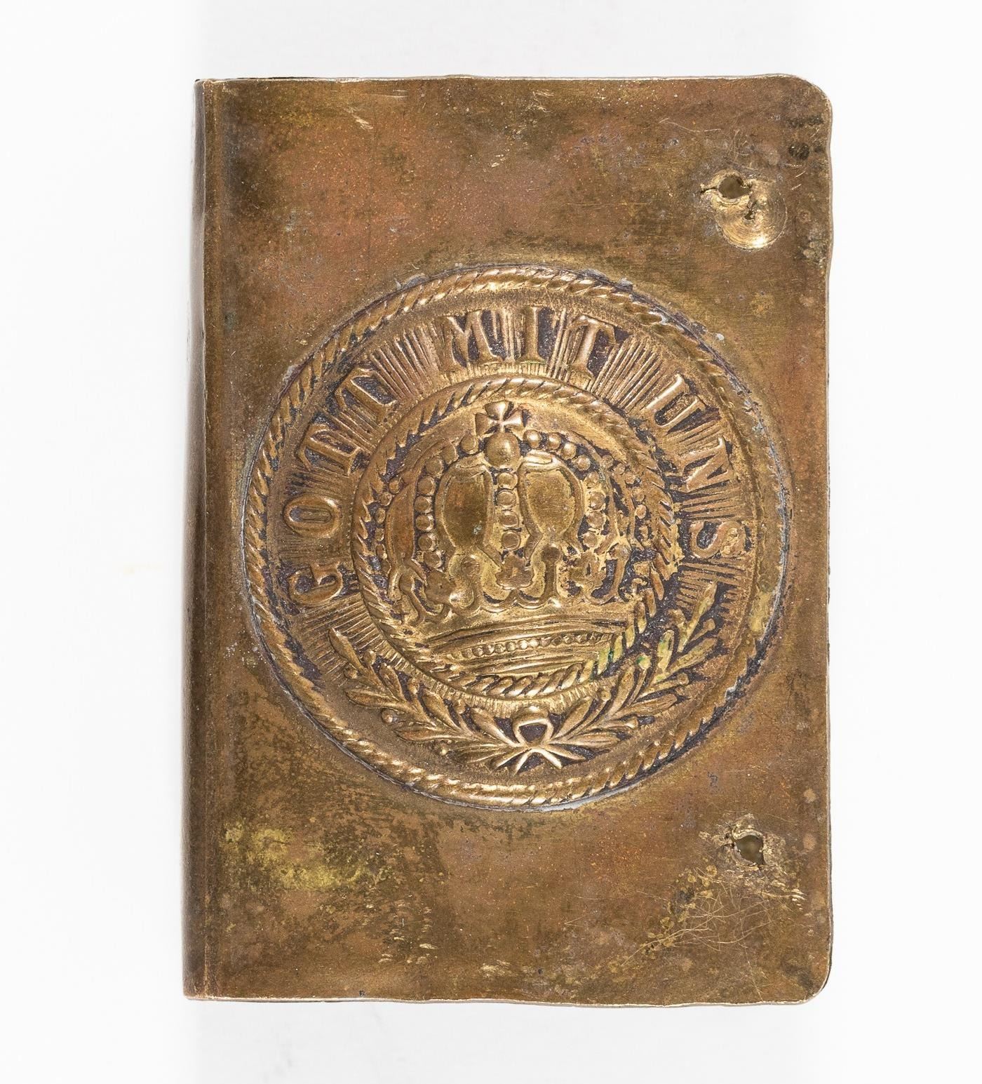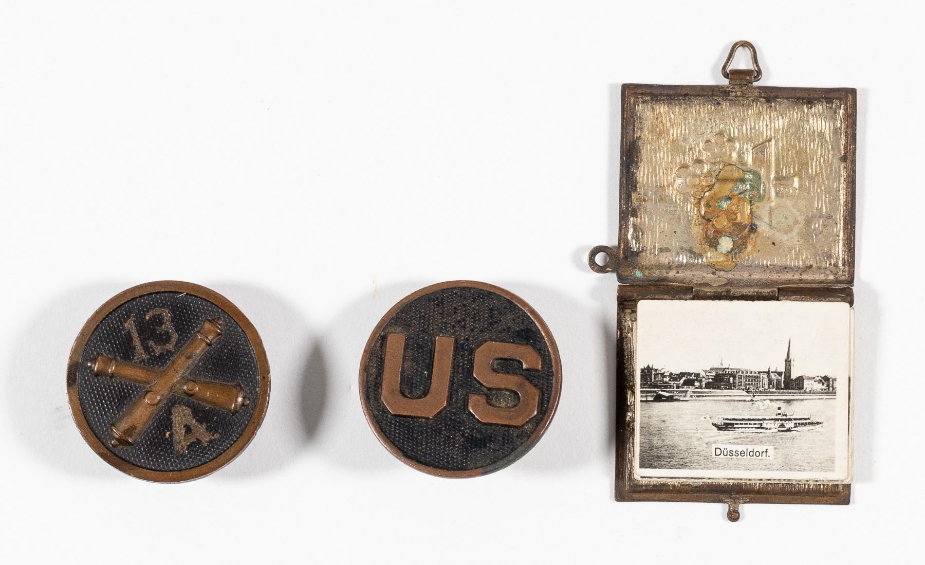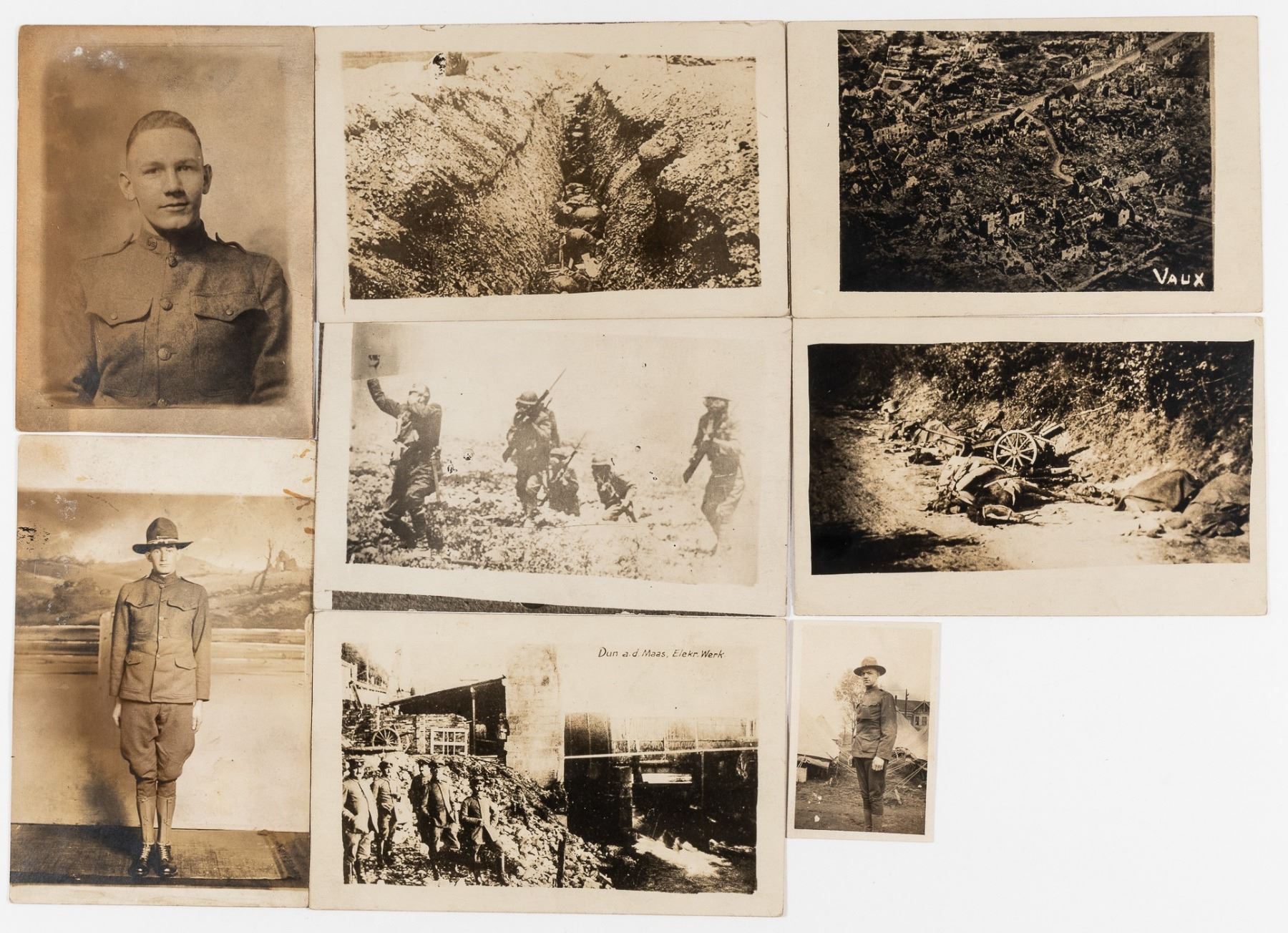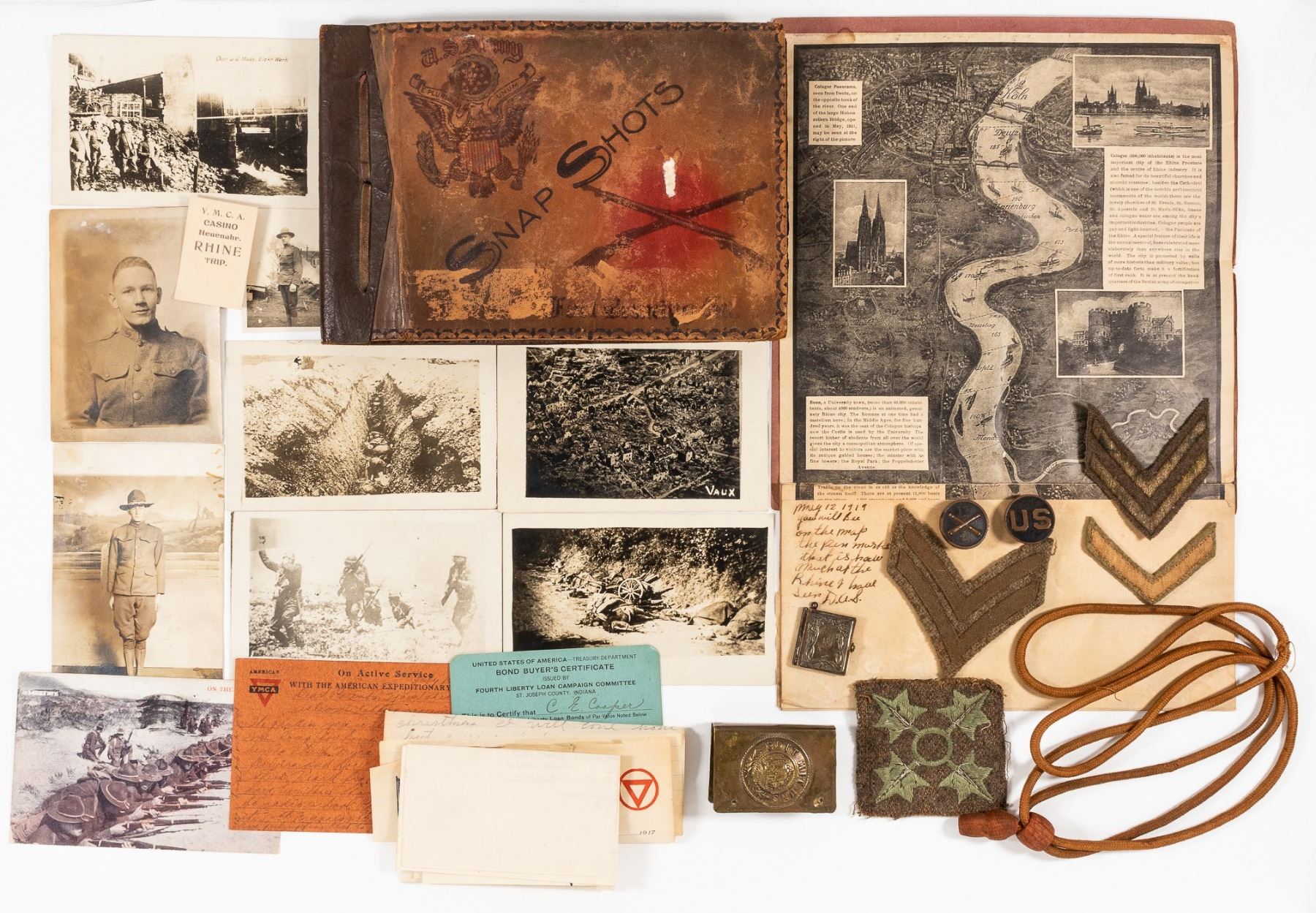 Photographs, letters, patches, buttons, souvenirs, and postcards once belonging to WWI soldier Joseph M. Cooper, Corporal of Battery 'A' of the 13th Field Artillery. The letters detail of his time in a hospital in 1917 and participation in a 4th of July parade in France. The photos show soldiers on the frontlines, dead war horses, aerial shots of Vaux, and Cooper in uniform. Cooper brought back souvenirs from WWI including a German brass matchbook cover 'Gott Mit Uns', three chevron patches, a 4th Infantry patch, a tourist map of the Rhine River, and a small souvenir photo album. Also included in lot is a WWI photo album once belonging to a different unknown soldier containing 81 photos of WWI soldiers and personal photos, 6.25 x 9.25 inches.