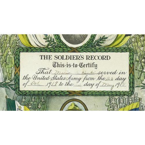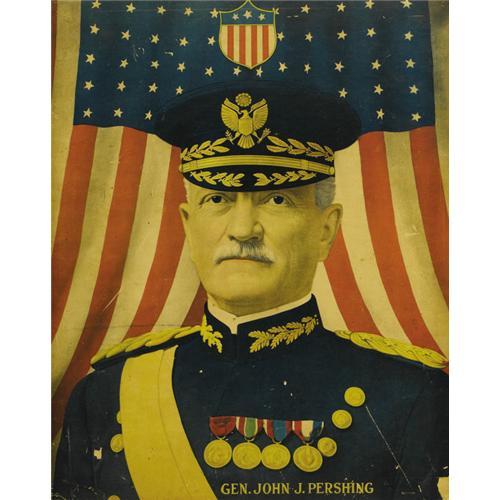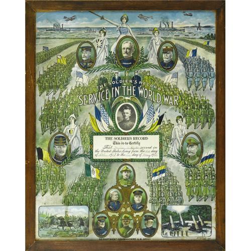 <B>World War I Service Record Certificate and John J. Pershing Portrait.</B></I> This lot contains two pieces from the first World War; a framed certificate of acknowledgement of service and a portrait of General "Black Jack" Pershing. Pershing would obtain the highest rank ever in the Armed Services, equal only to that of the posthumous George Washington. His efforts in the Great War would hasten the allies victory in the war. Having acquired his new rank of General of the Armies of the United States, he was authorized to create his insignia for the rank but he declined. He wore the four stars of a regular general for the rest of his life. This portrait was painted by G. Renesch and printed in lithograph onto this hard card stock backing. The overall color of the portrait has turned yellow from acid degradation; the lower right corner is torn and missing; small imperfections and chipping throughout. Portrait measures 16" x 20". <BR><BR>The service record is a more personal item and was issued to the serviceman pictured in the center of the document; Marion Rankin. The certificate states that he served from October 23, 1917 to May 20, 1919. Many major military figures are pictured, including Pershing, Joffre, King Albert, and Wood. Surrounding these images and the inscription are battalions of troops from all nations, and several battle scenes on land and sea. A handsome display! In excellent condition aside from some slight staining in the lower corners; foxing present in the lower left. Framed to an overall size of 18" x 22".