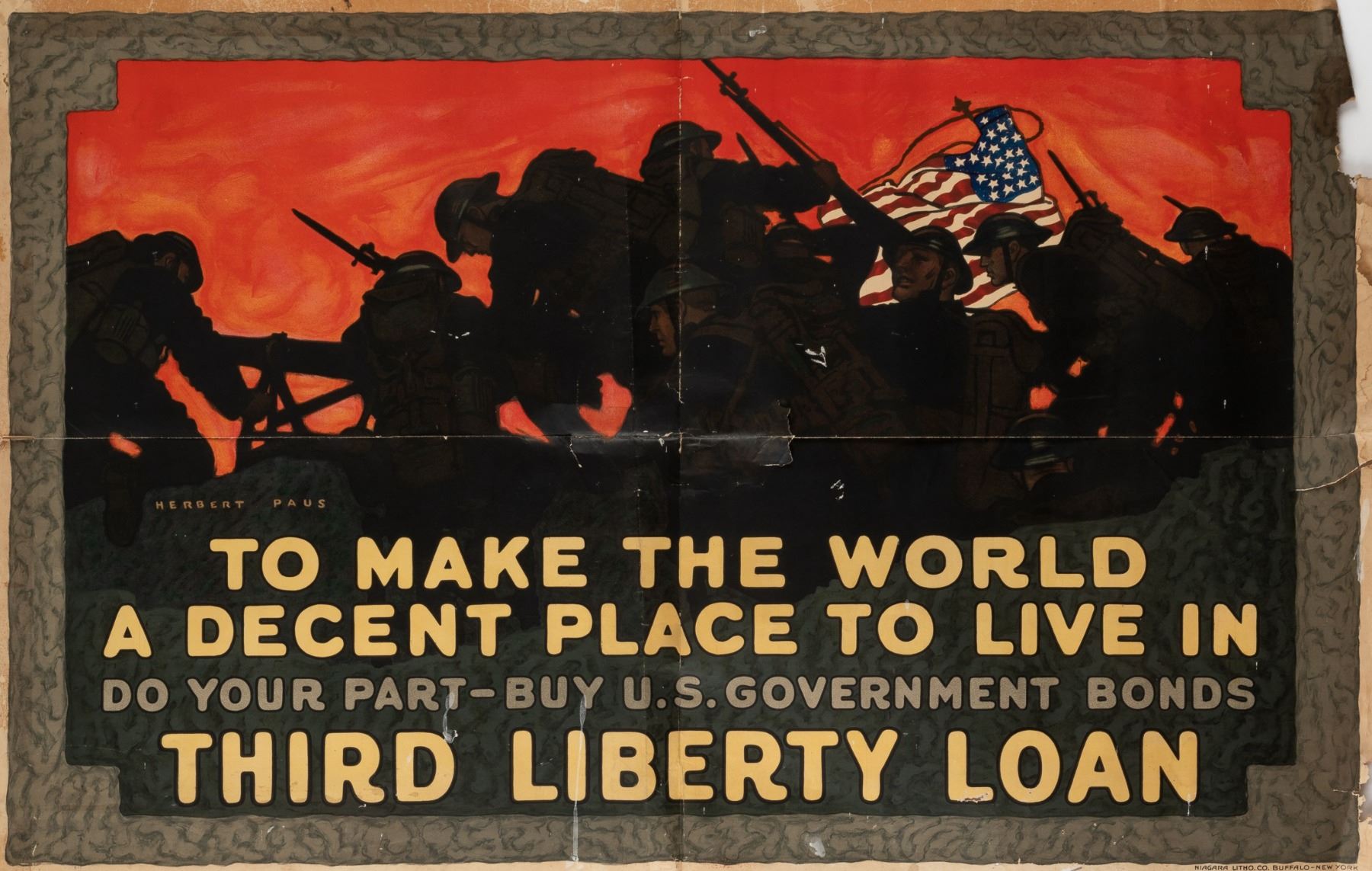 'To make the world a decent place - Do Your Part - Buy U.S. Government Bonds - Third Liberty Loan', artwork by Herbert Paus (1860 - 1944), Niagara Lithograph Company, Buffalo, N.Y., 56 x 36 inches. Poster is split at folds, repair with tape, few paint stains on obverse, tears at margin, and loss at top and bottom right margins. Worthy of restoration.