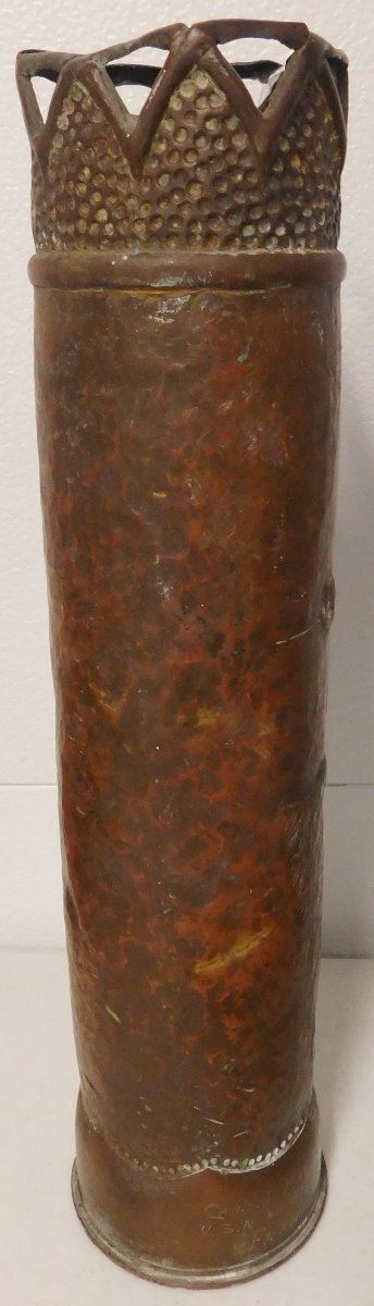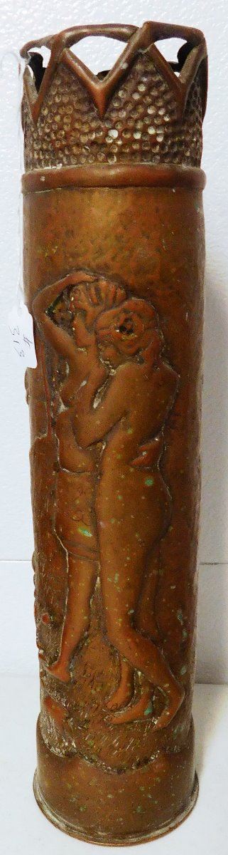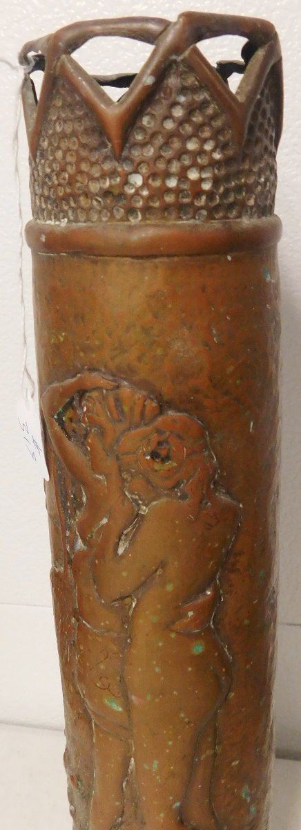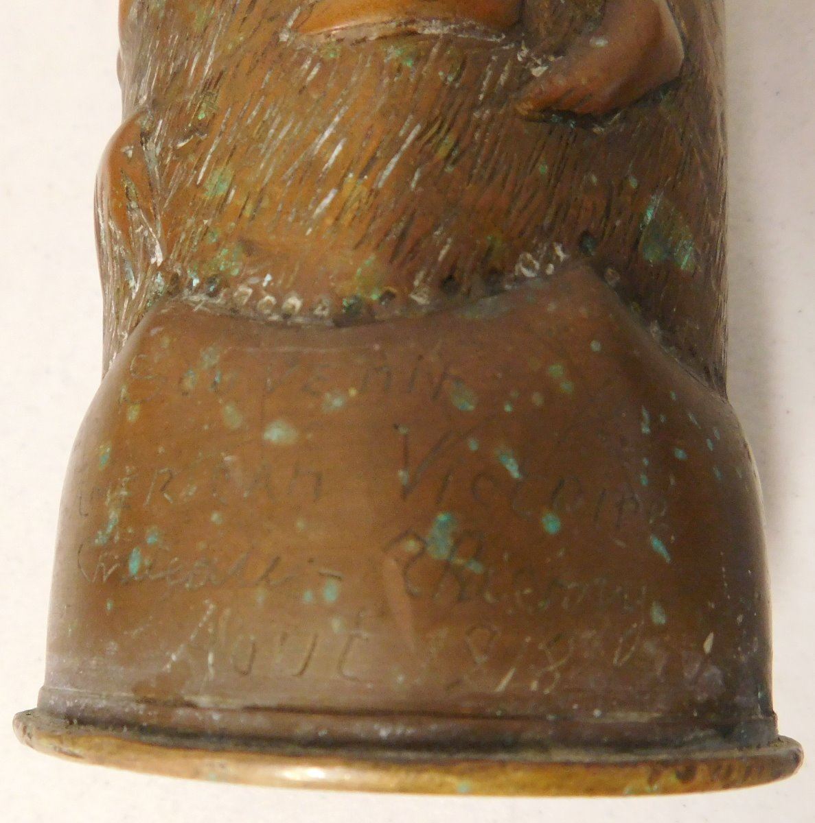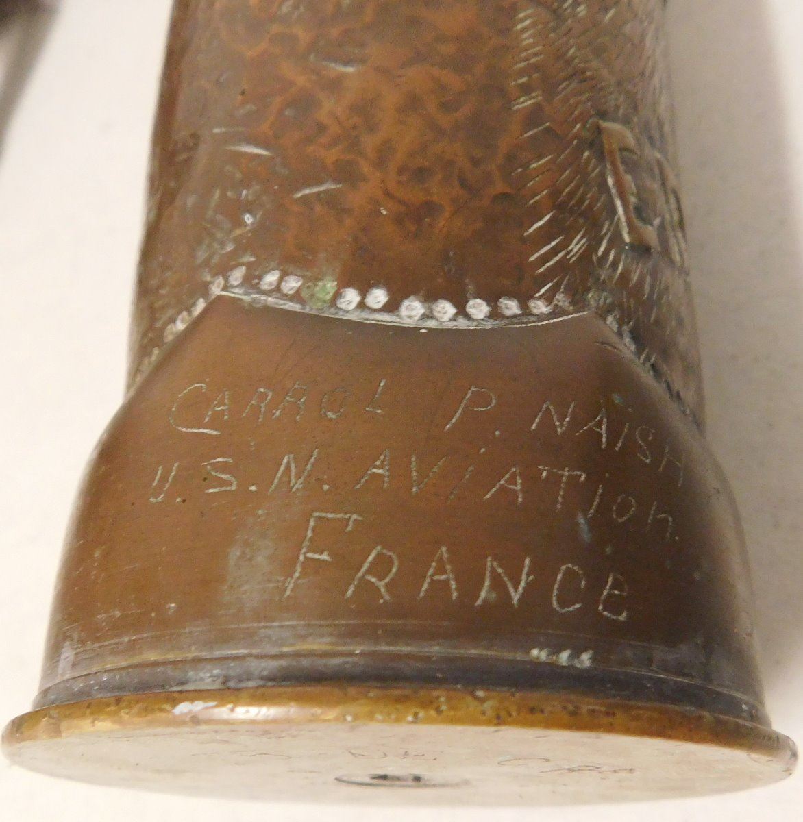 WWI Trench Art, dated 1918. Made of brass, the item is 13.5" x 3. Signed Carrol P. Naish. Inscribed with 1918 and France, with other info. 2 women looking at sea! Condition: Patina, some bending on top, see images. Shipping: $28.50 w/insurance and signature, due to length and weight.
