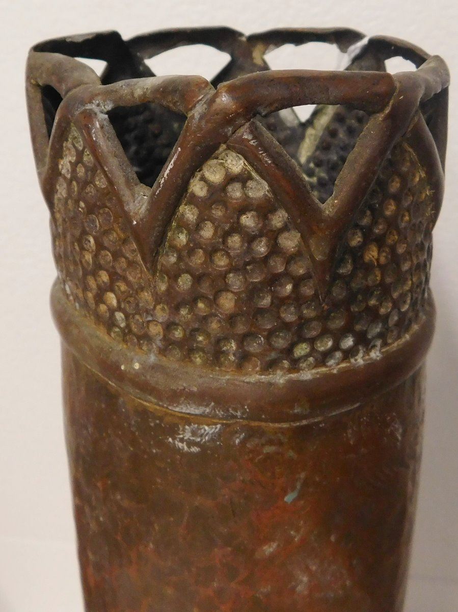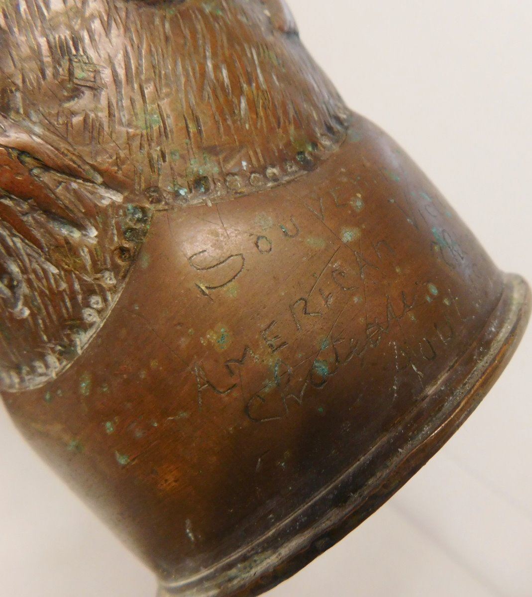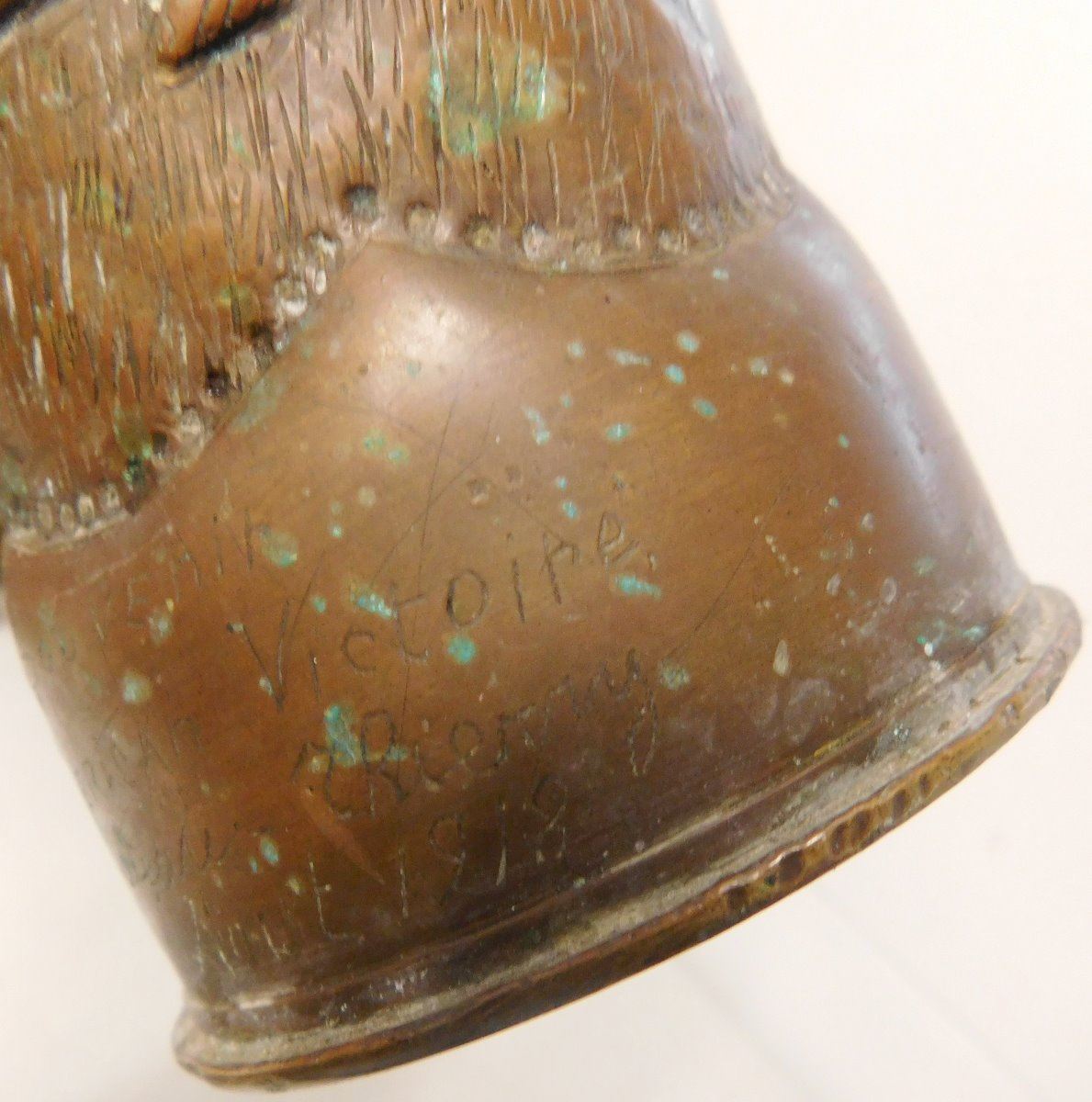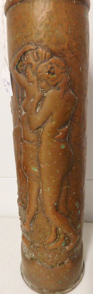 WWI Trench Art, dated 1918. Made of brass, the item is 13.5" x 3. Signed Carrol P. Naish. Inscribed with 1918 and France, with other info. 2 women looking at sea! Condition: Patina, some bending on top, see images. Shipping: $28.50 w/insurance and signature, due to length and weight.