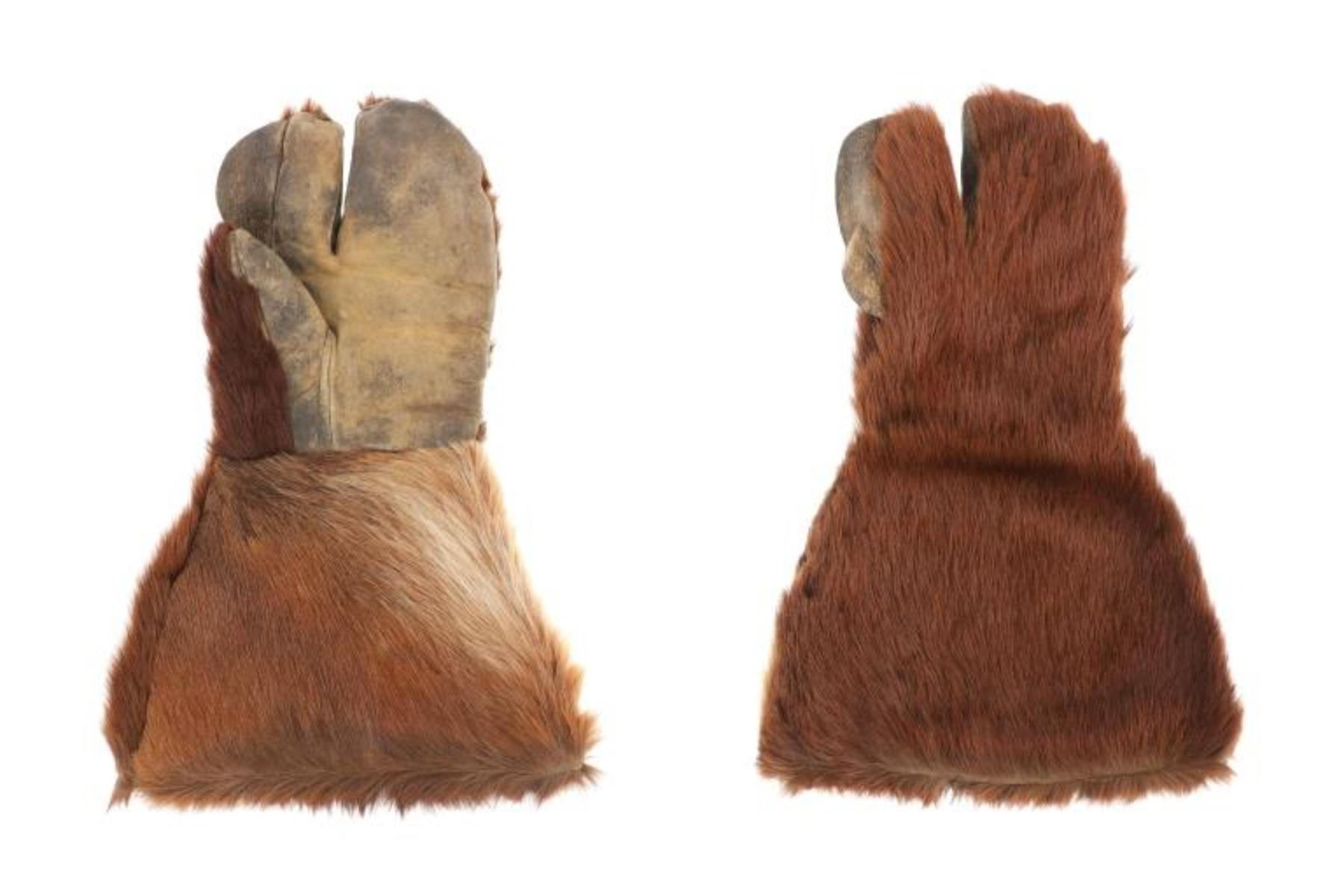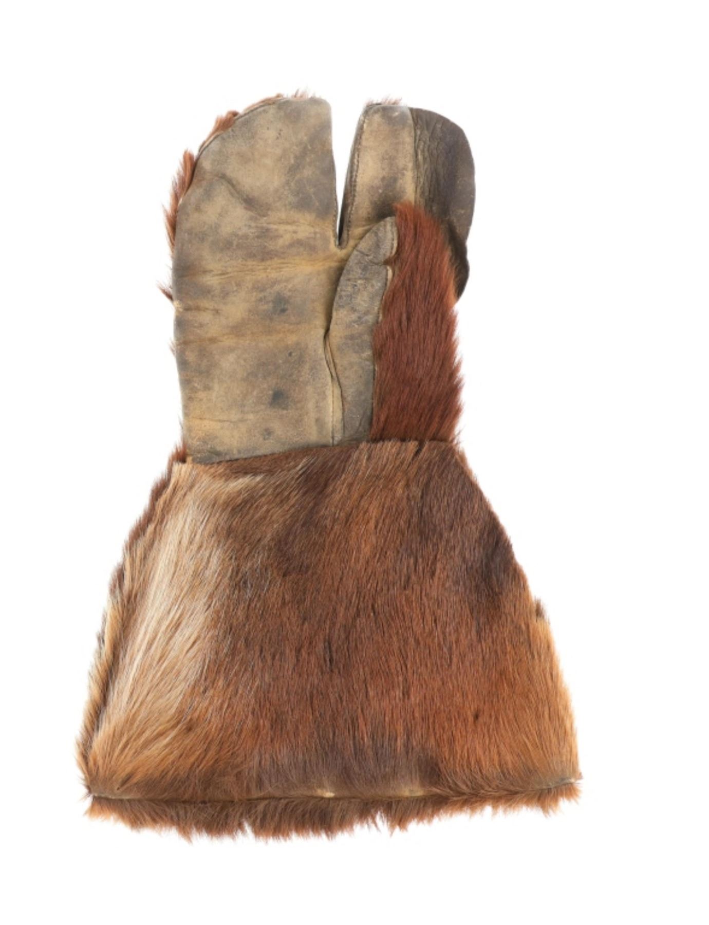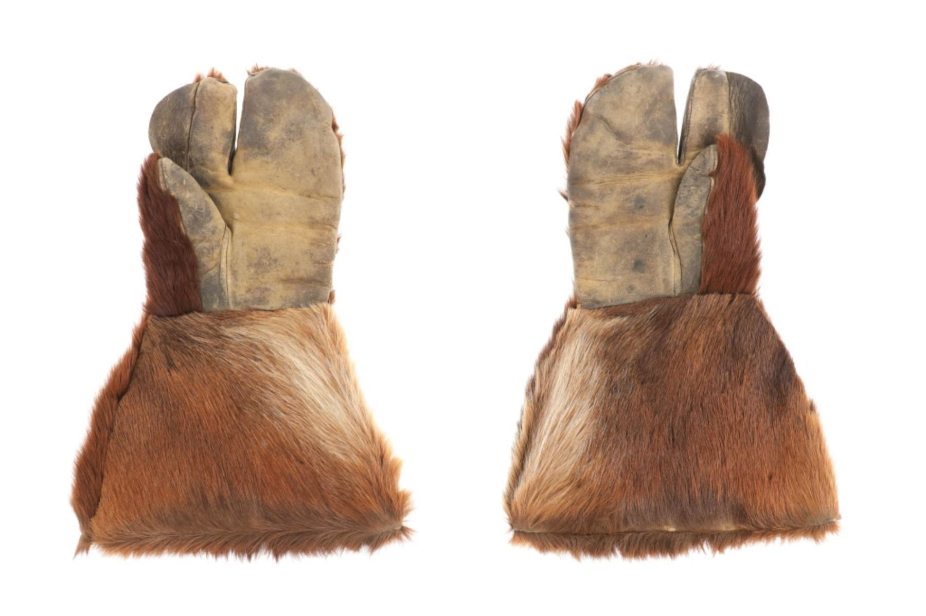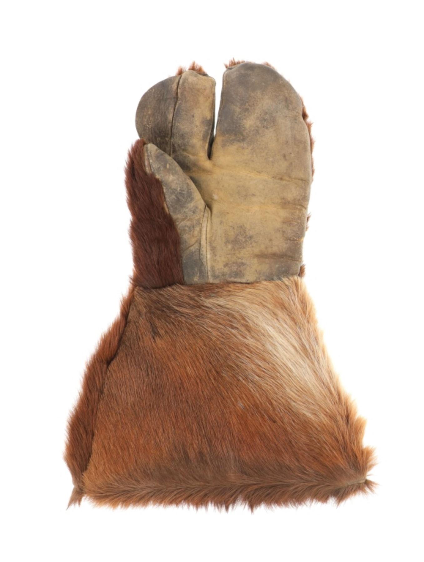 Featured in this lot is this WWI trench infantry hide gauntlets circa 1910 to 1920's. The gauntlets feature a wonderfully and professionally crafted bear hide construction that shows a split mitten design that frees up the trigger finger. The bear hide shows a reddish brown coloration with flaps of leather to protect. from the cold and re loading. The condition of this pair of WWI Infantry gauntlets is well preserved that shows some wear to the leather palm portion of the gauntlets. The gauntlets measure 14 3/4" x 10 1/4". The collective weight of this pair of gauntlets is 1lb 4oz.