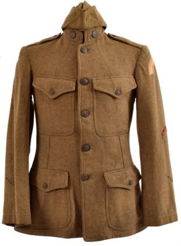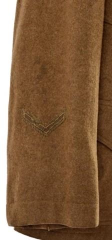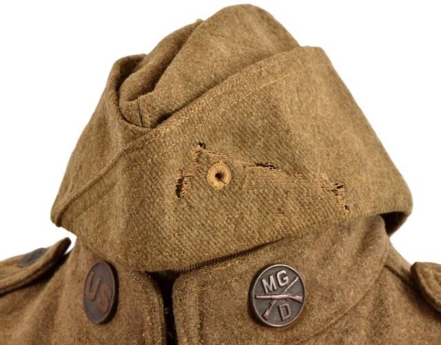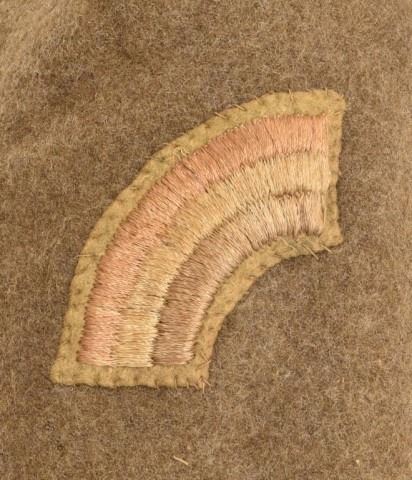 Rainbow Division Patch on left shoulder, Machine Gun D Company Collar Brass, one wound stripe and 6 months overseas service stripe.