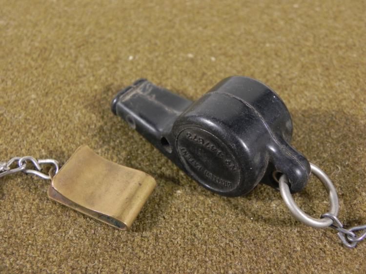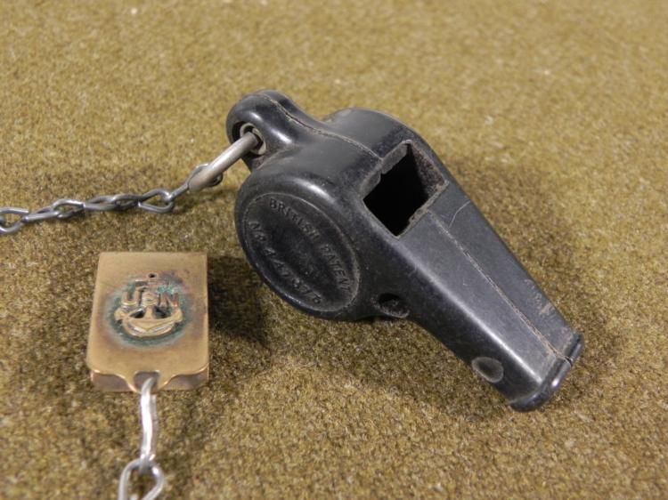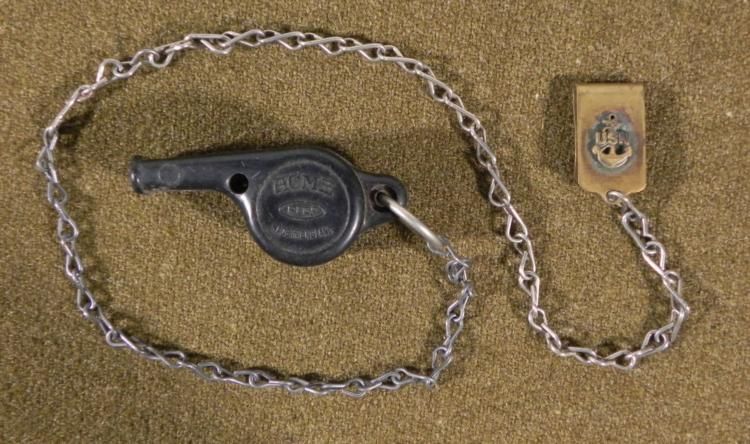 HERE IS AN WWI U.S. NAVY WHISTLE ON A CHAIN WITH AN USN INSIGNIA ON A BRASS CLIP. IT IS 21" LONG AND THE WHISTLE IS MARKED ACME-MADE IN ENGLAND. *