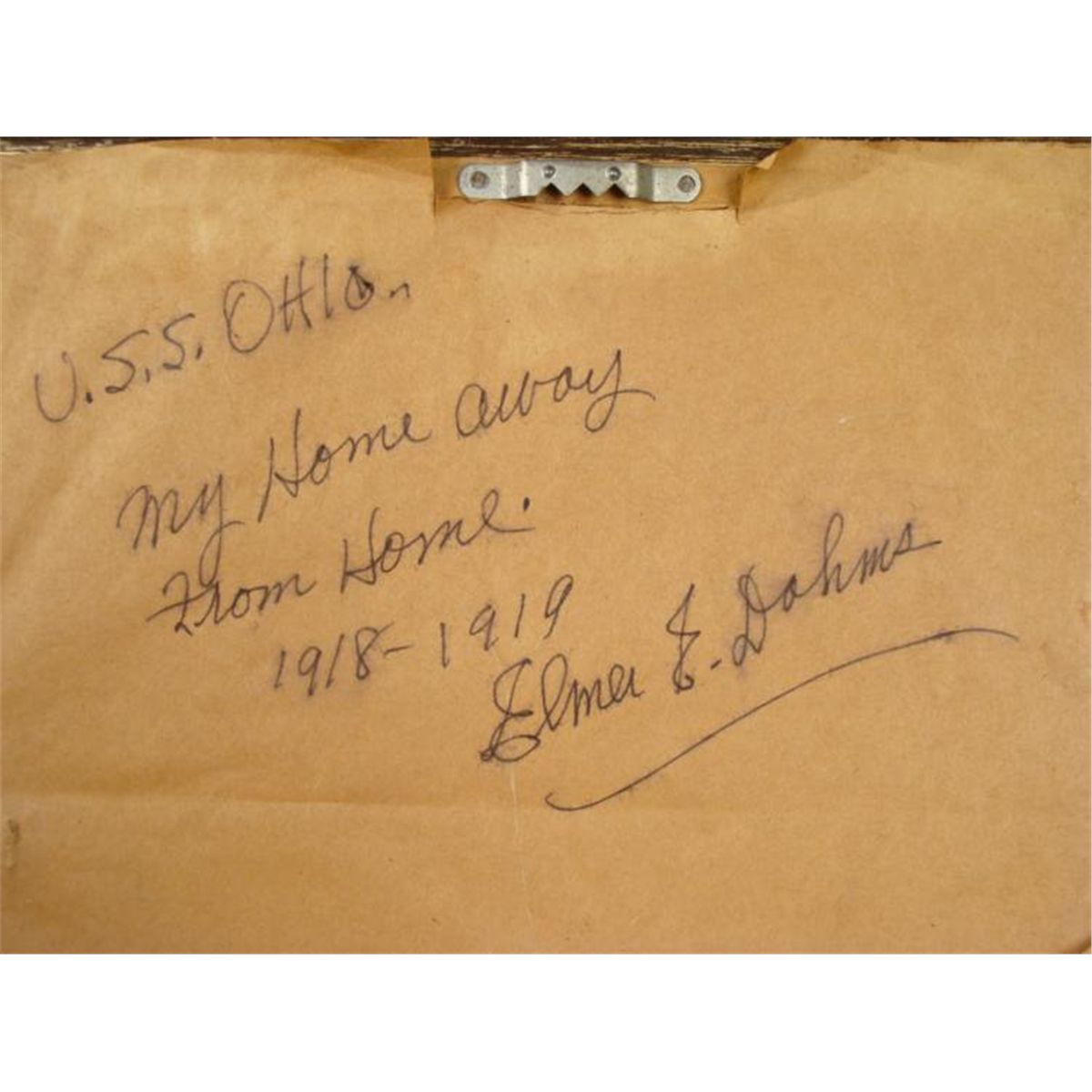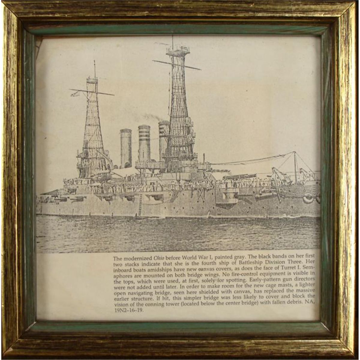 WWI U.S. SHIP U.S.S. OHIO DRAWING FRAMED-DEDICATION ON BACK-I.D.'D * REVERSE READS "USS OHIO-MY HOME AWAY FROM HOME-1918-1919--ELMER E. DAHMS. IN 9 X 9" FRAME. * *