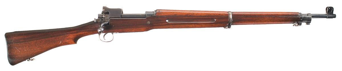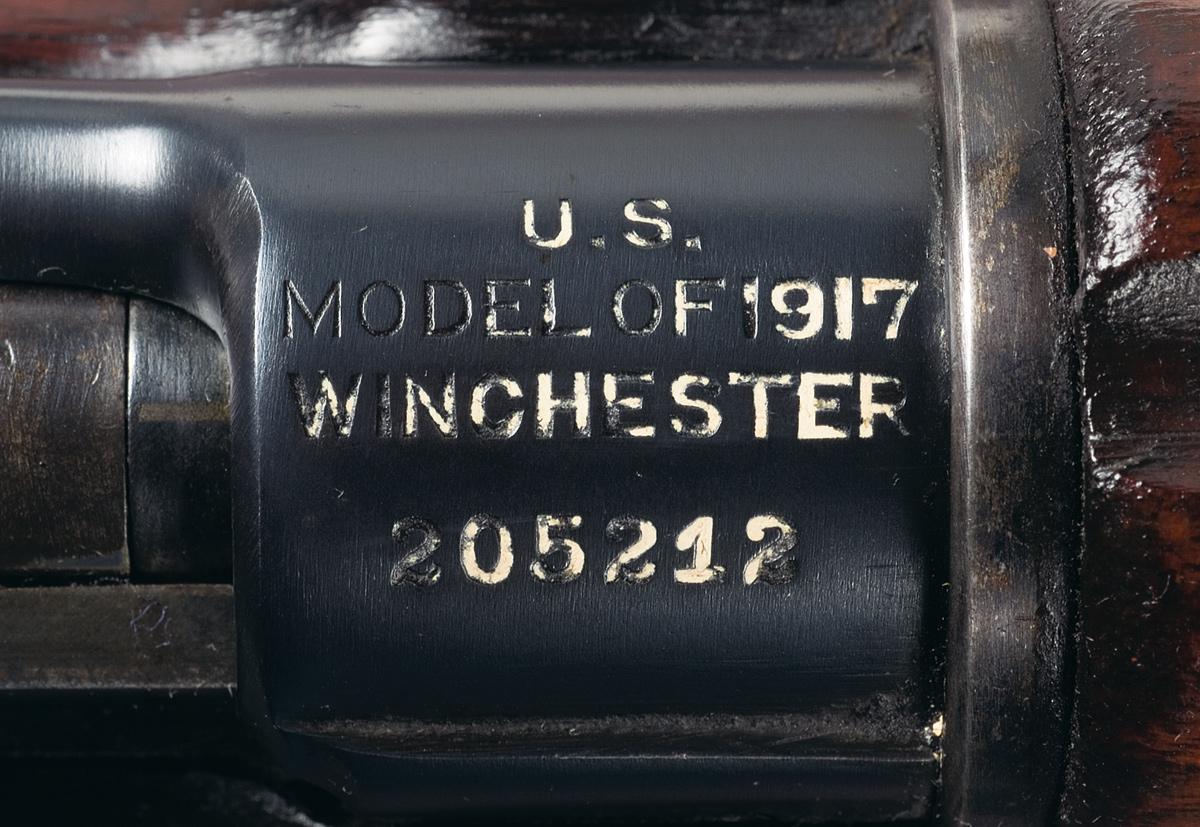 This is a very fine example of a U.S. WWI Winchester Model 1917 bolt action rifle. These 1917 rifles were the primary WWI bolt action service rifle and were eventually used even into the early part of WW II. They are a primary piece in any martial arms collection. The top of the receiver has the standard markings of "U.S./MODEL OF 1917/WINCHESTER/205212" in four lines. The barrel is stamped with "W"/ ordnance bomb/"3-18". The majority of the various major components are correctly marked with a "W" except the complete bolt assembly which was produced by Remington Arms. The "eagle-head/500" and "eagle-head/04" inspection marks are stamped on the underside of the stock in front and in back of the trigger guard. The left side of the receiver rail is stamped with the ordnance bomb and the top of the receiver rail has two eagle-head inspection stamps. All components have a deep, nearly commercial quality, blue finish and the stock and handguard are oil finished walnut.