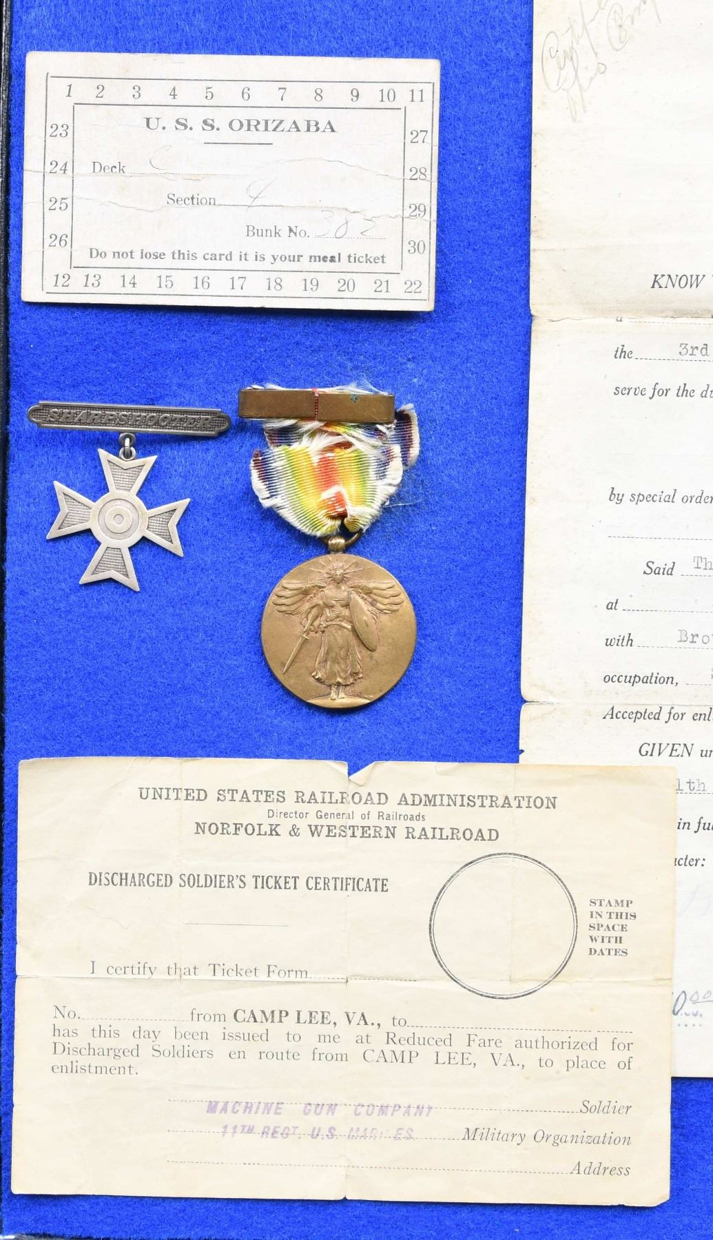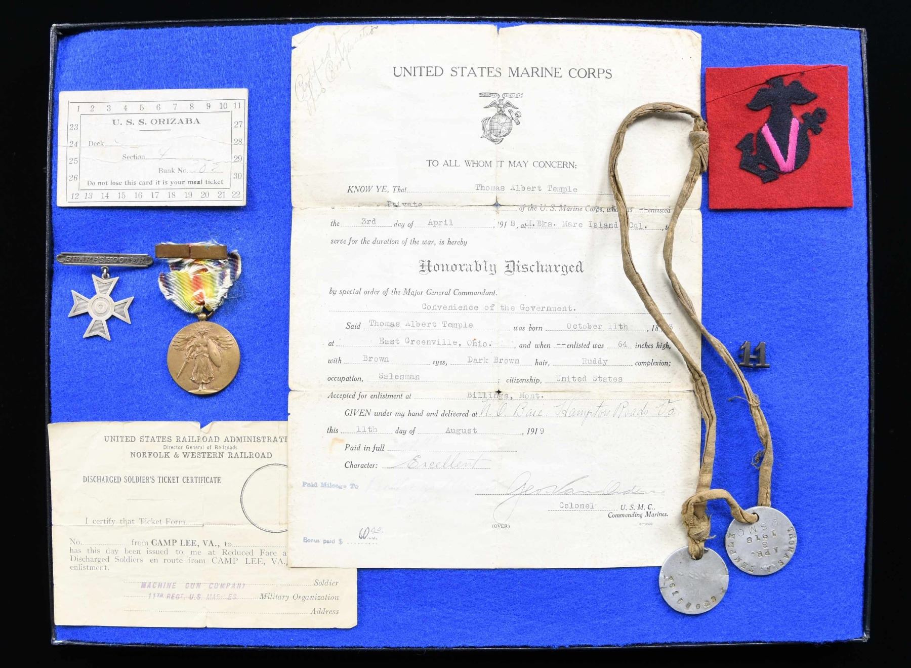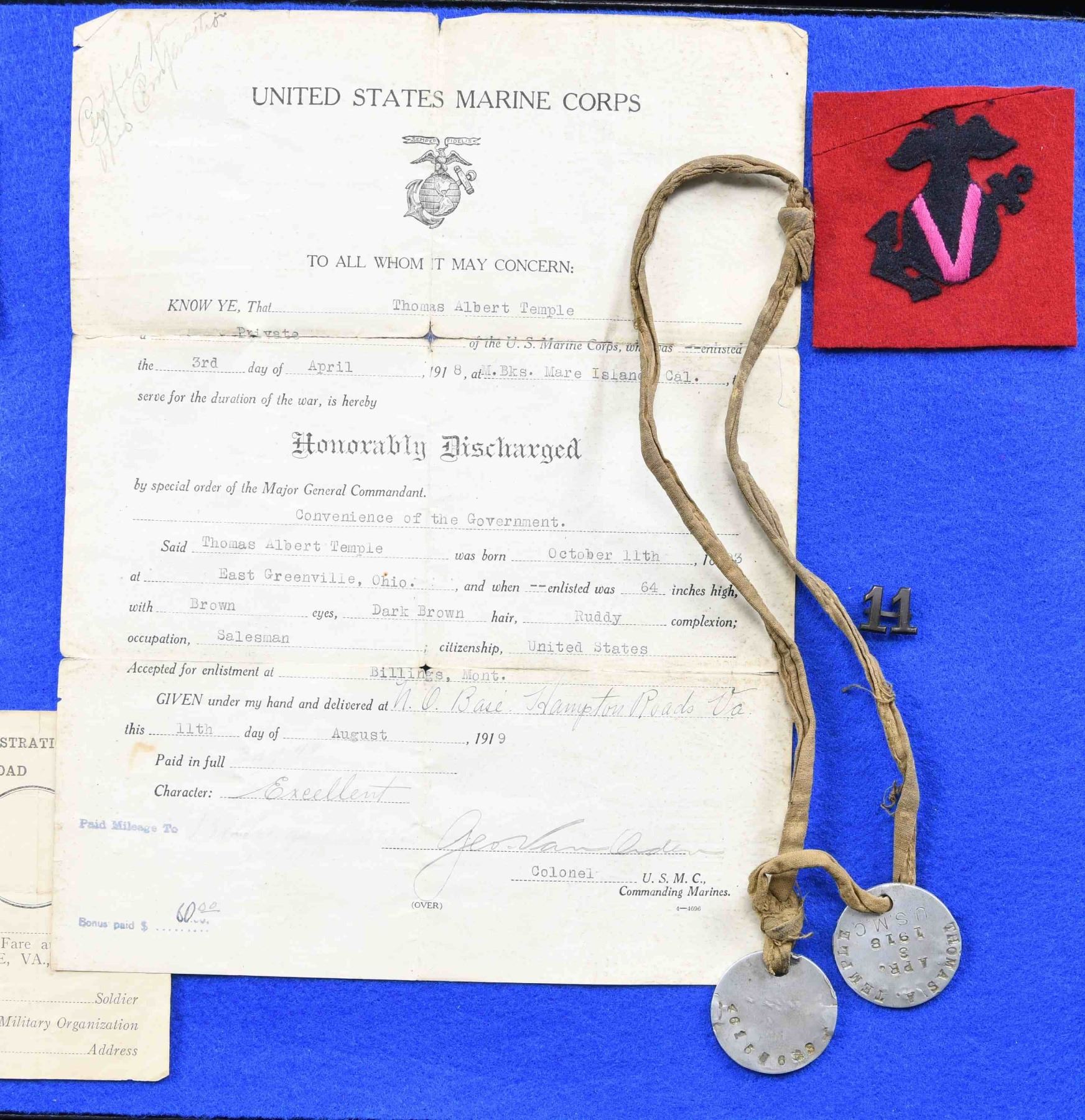 TAG, AND MORE. This Marine group belonged to Private Thomas Albert Temple who enlisted at Billings, Montana. The group includes 1 5th Marine Brigade patch with a pink embroidered "V" on a wool felt EGA, all on a red field. / 1 pair of WWI dog tags that read "THOMAS A. TEMPLE APR. 3 1918 U.S.M.C." & "4615563". The tags are tied together with a khaki cotton cord. / 1 WWI Victory medal with worn ribbon. / 1 sharp shooter qualification badge. / 1 subdued "11" pin. / 1 "U.S.S. ORIZABA" 30 meal pass. / 1 Norfolk & Western Railroad discharge soldier's transportation certificate. / 1 honorable discharge from the Marine Corps. These items have all been together since the war and were obtained by the consignor from the family. CONDITION: all items show expected wear. Medal ribbon is tattered. Patch has a cut near the top that has been stabilized with tape. (02-24273/BF). NON-GUN. $400-600.