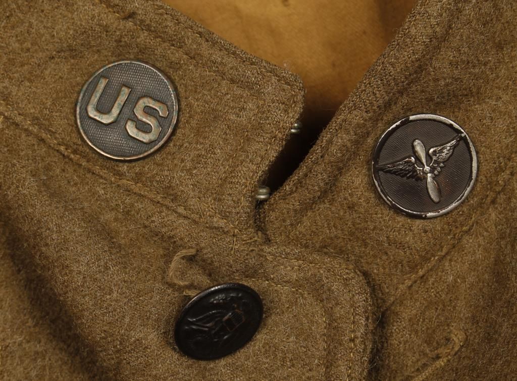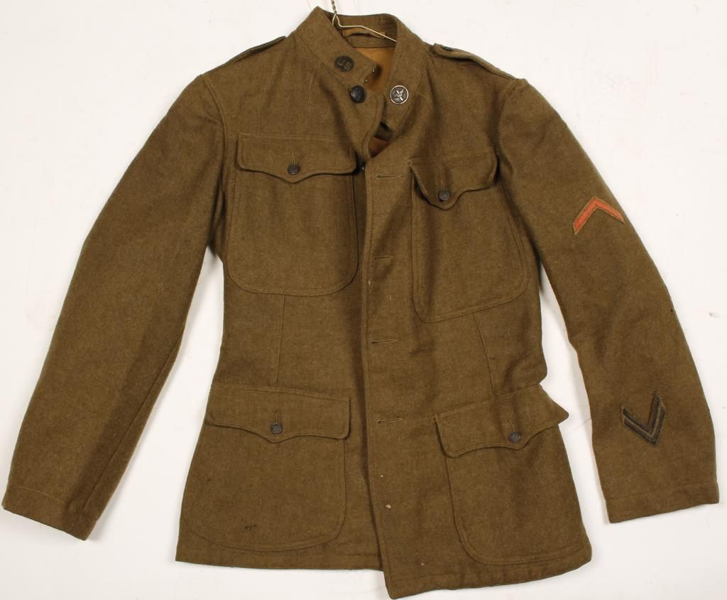 American Eagle Buttons, collar hooks, inside tag reads, "USA Coats 40". Size 40. Epaulets. Four patch pockets. Holes in the fabric on the front and left sleeve. Two chevrons on left sleeve.