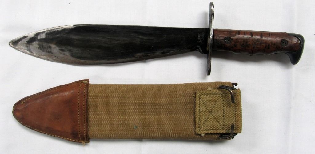PLUMB ST LOUIS 1918- WITH SCABBARD MARKED E.O.N. WOOD HANDLE WITH NOTCHES CARVED IN- HAS BEEN RESHARPENED BUT IN NICE CONDITION