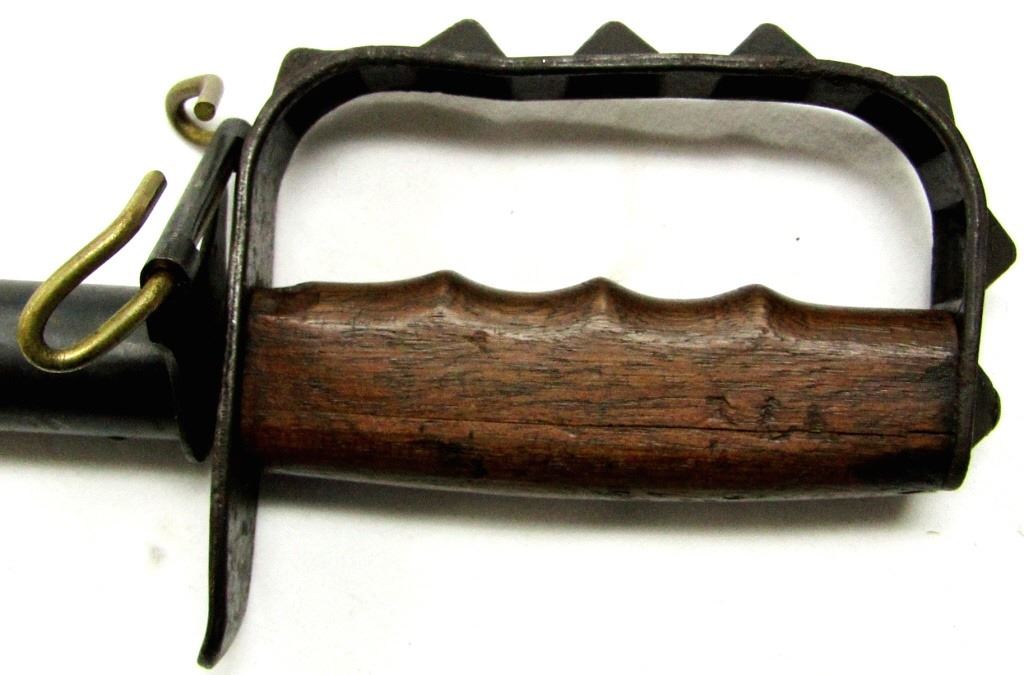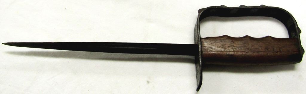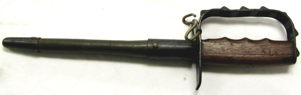 KNUCKLE BUSTER- WALNUT HANDLE- HAS ORIGINAL SCABBARD. HANDLE HAS SOME SPLITS BUT IT IS STILL SOLID. OVERALL VERY NICE CONDITION- SOME VERY LIGHT RUST ON THE INSIDE OF THE KNUCKLE GUARD