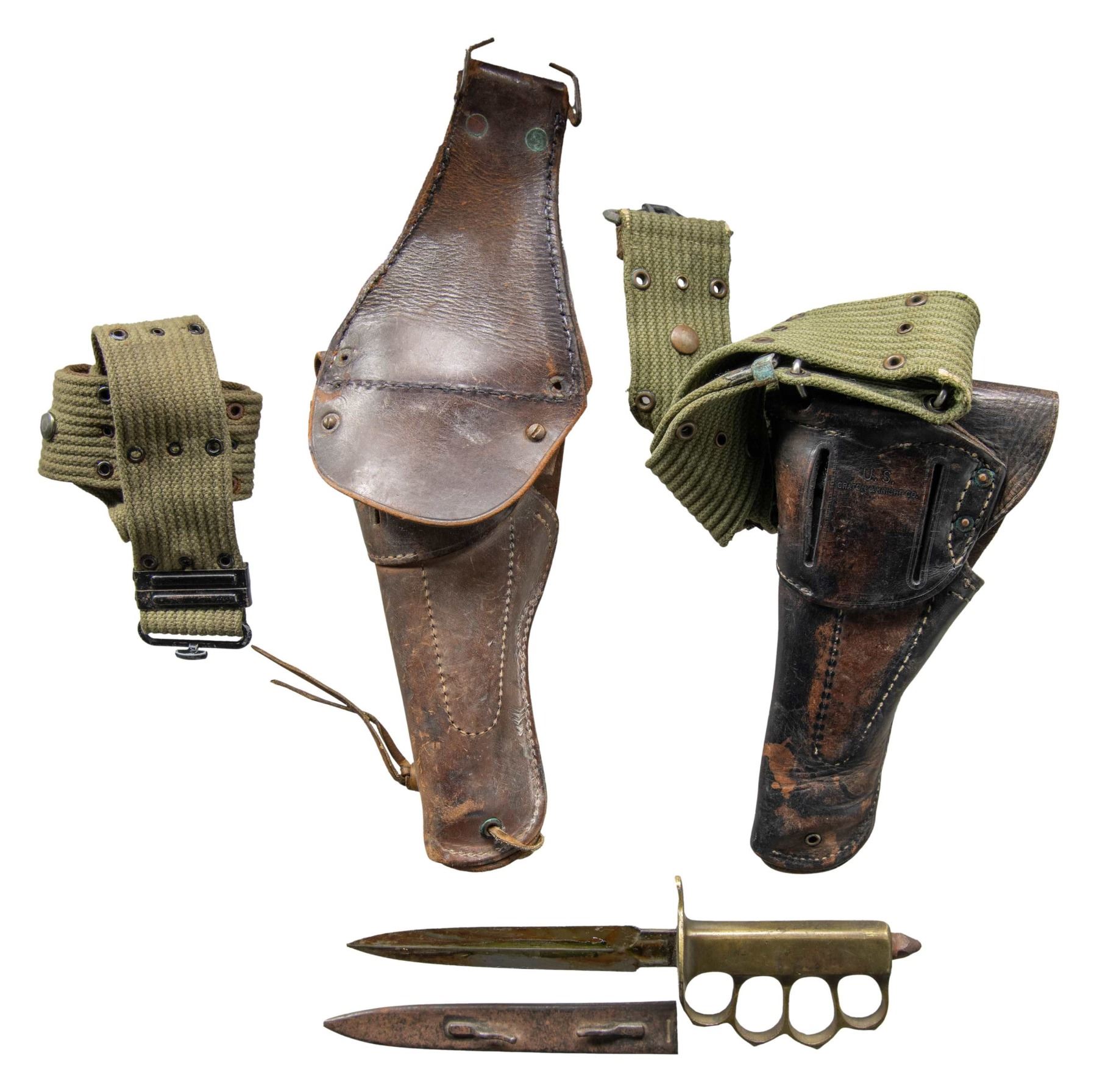 This lot includes the following, 1) fine WWI US M1918 trench knife and scabbard measuring 12 1/4" inches overall with a 7 5/8" blade marked " (logo) AU LION ". The sold brass hilt is marked " U S 1918 " and has 4 finger holes. There is an iron "skull crusher" nut on the pommel. Thin iron scabbard with 2 belt studs intact. CONDITION: blade is covered in storage grease but will clean to a nice finish. Hilt shows light wear with a mellow patina. Scabbard shows light oxidation. 2) 2 WWII US M1911 holsters on OD cotton pistol belts. CONDITION: holsters show moderate wear and the belts show light wear. (02-24441-1/BF). $800-1300.