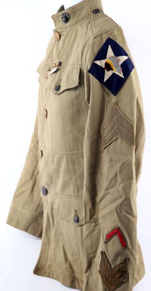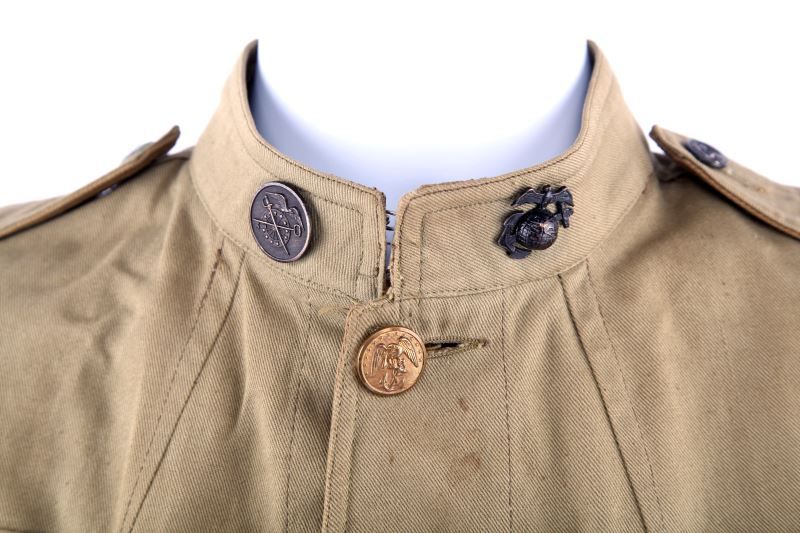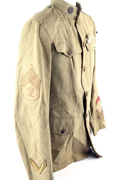 Four button front tropical green tunic, Quartermaster collar disc with EGA, , Quartermaster SGT stripes, wound and service badges, marksman and campaign ribbon, condition very good.