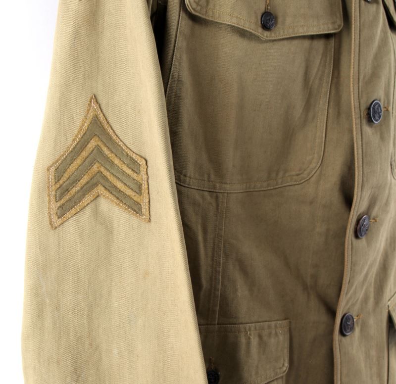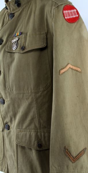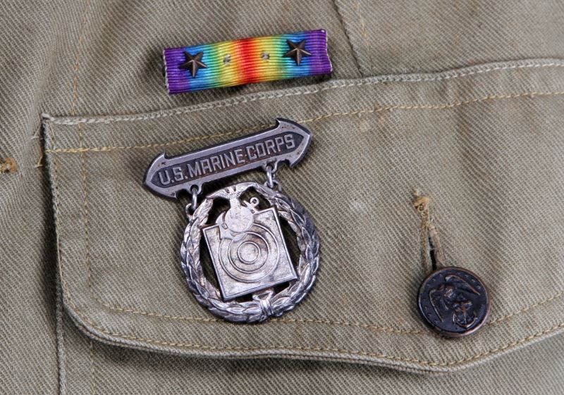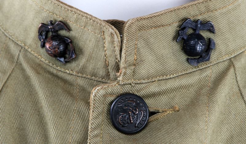 WWI USMC tunic with USMC badges, buttons, chevrons, globes, and service ribbons, and Camp Pontanezen France engineer patch. Overall very good condition. Likely enhanced with period insignia.