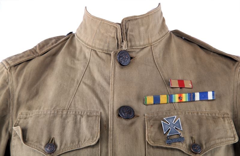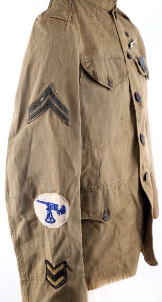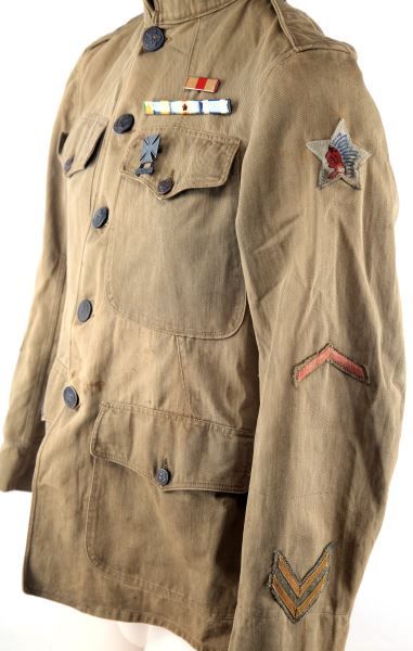 Overall good condition tunic with some mothing to wool insignia, Corporal, gun pointer patch, service stripe, wound and foreign service chevrons, Mexican War ribbon, Service and Occupation and others, 2nd Division patch, sterling silver Marksman badge,