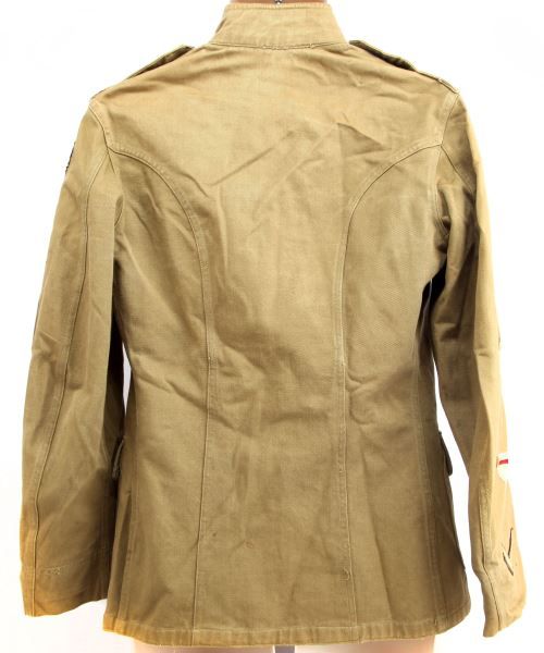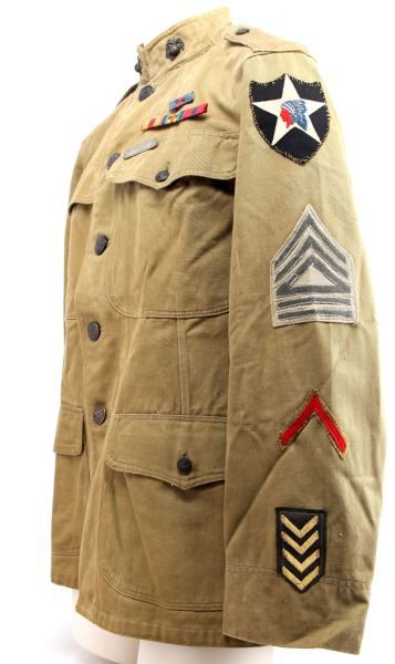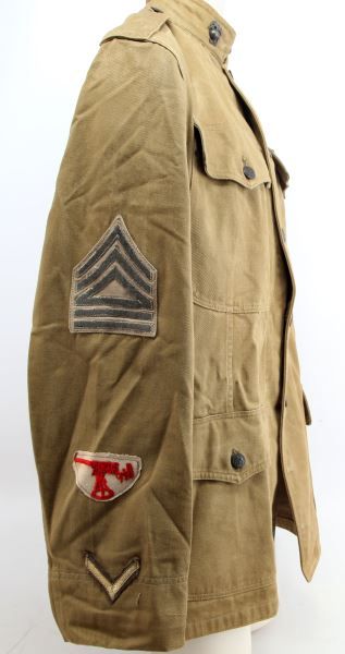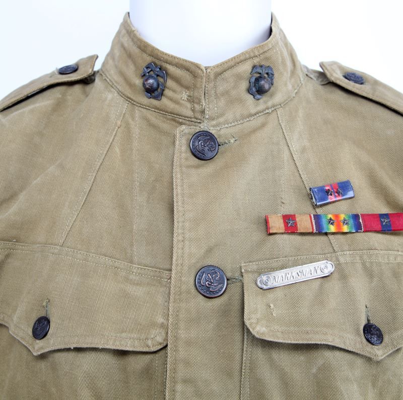 Mustard tunic with correct EGA buttons and collar insignia, 9th Machine Gun Company patch, wound stripe, service chevrons and stripes, Gunnery Sargent sleeve rank insignia, ribbons and marksman badge, all appears original but tunic is believed embellished, unnamed, and without dates or makers stamp, free of damage and stains, some service wear noted.