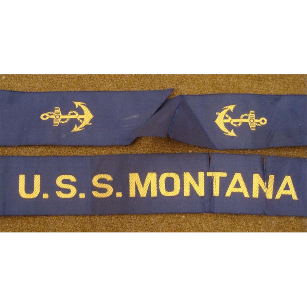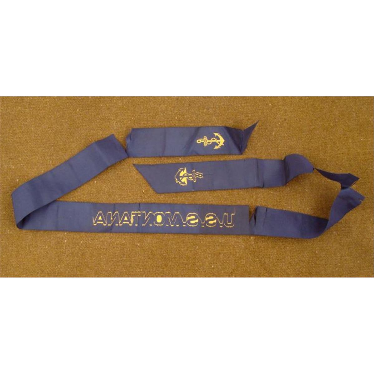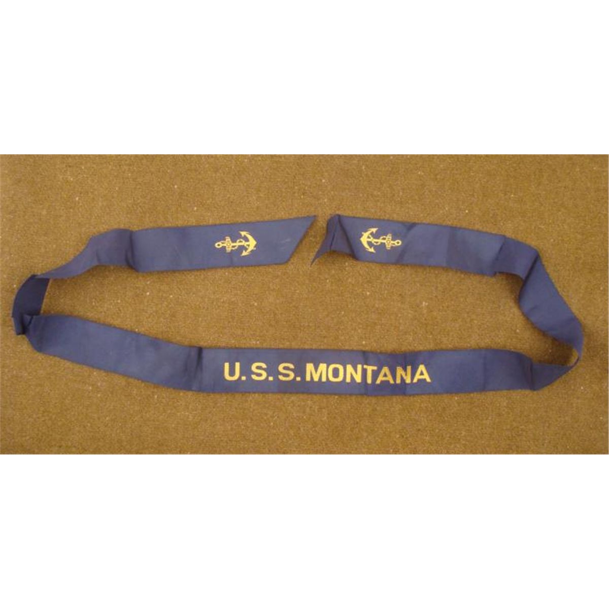 OFFERED HERE IS A WWI "USS MONTANA" BATTLESHIP HAT TALLY. IT HAS ITS FULL DRESS TALLY WITH ANCHORS AND MEASURES OUT TO BE 35". THIS BLUE NAVAL TALLY HAS GOLD LETTERING AND ANCHORS AT END. THERE ARE SEVERAL TEARS TO THE RIBBON. THIS IS A NICE DISPLAY PIECE FROM THIS HISTORICAL BATTLESHIP. *