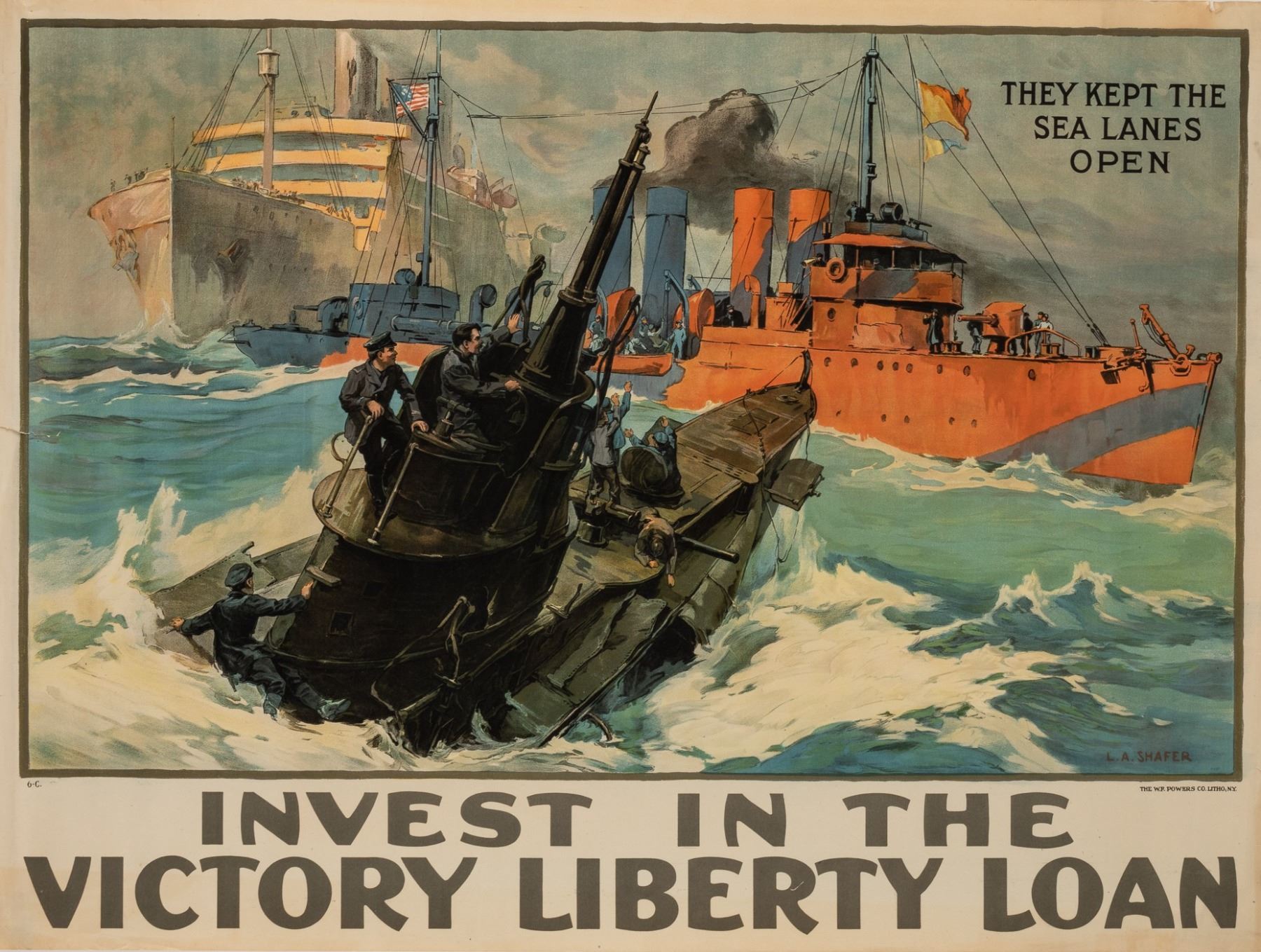 WWI poster, 'Invest in the Victory Liberty Loan', artwork by Leon Alaric (L.A.) Shafer (1866 - 1940), The W.F. Powers Co. Litho., N.Y., 29 x 39 inches. 2.5-inch on left side, minor tears, minor creases, and minor toning on right edge.
