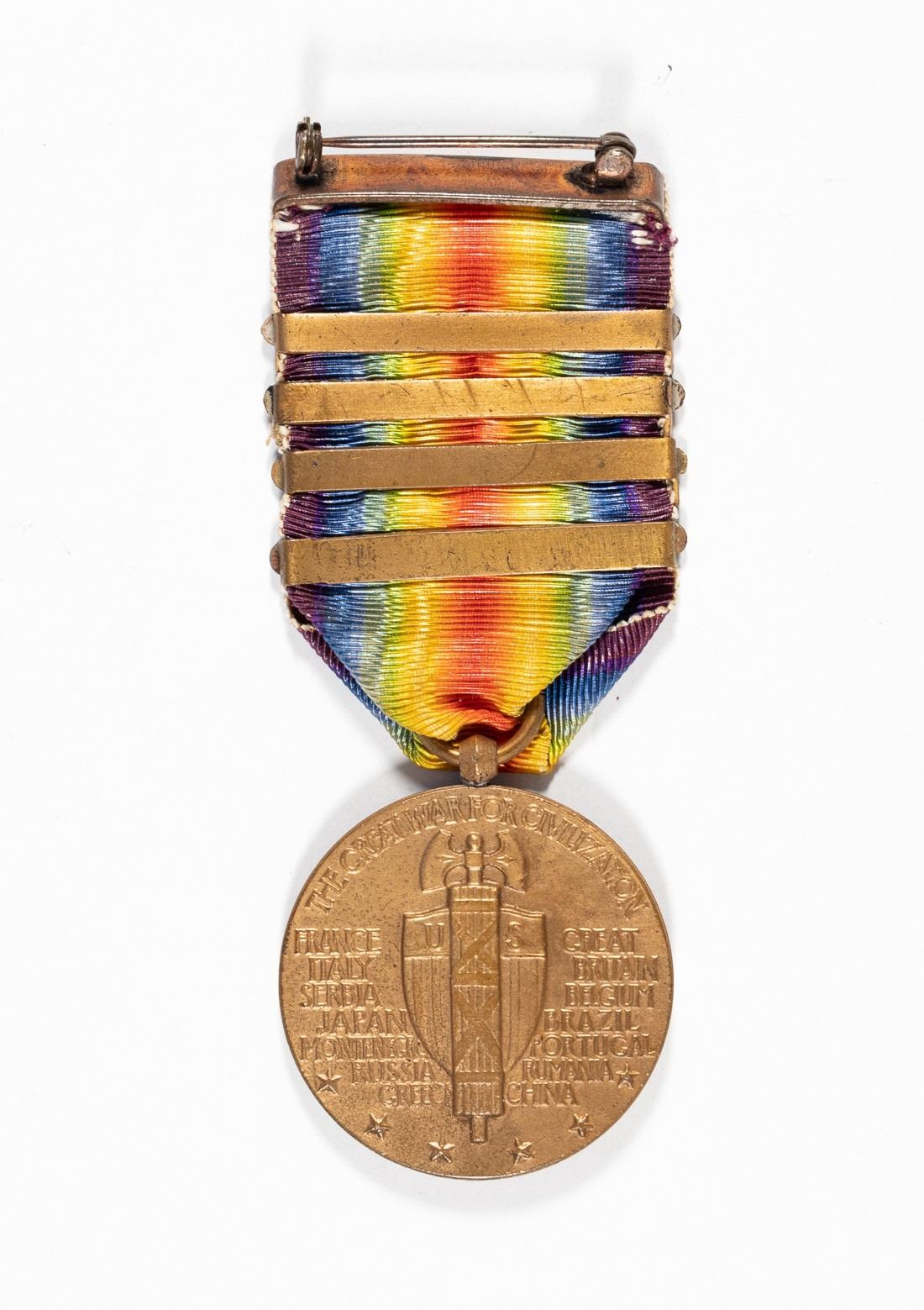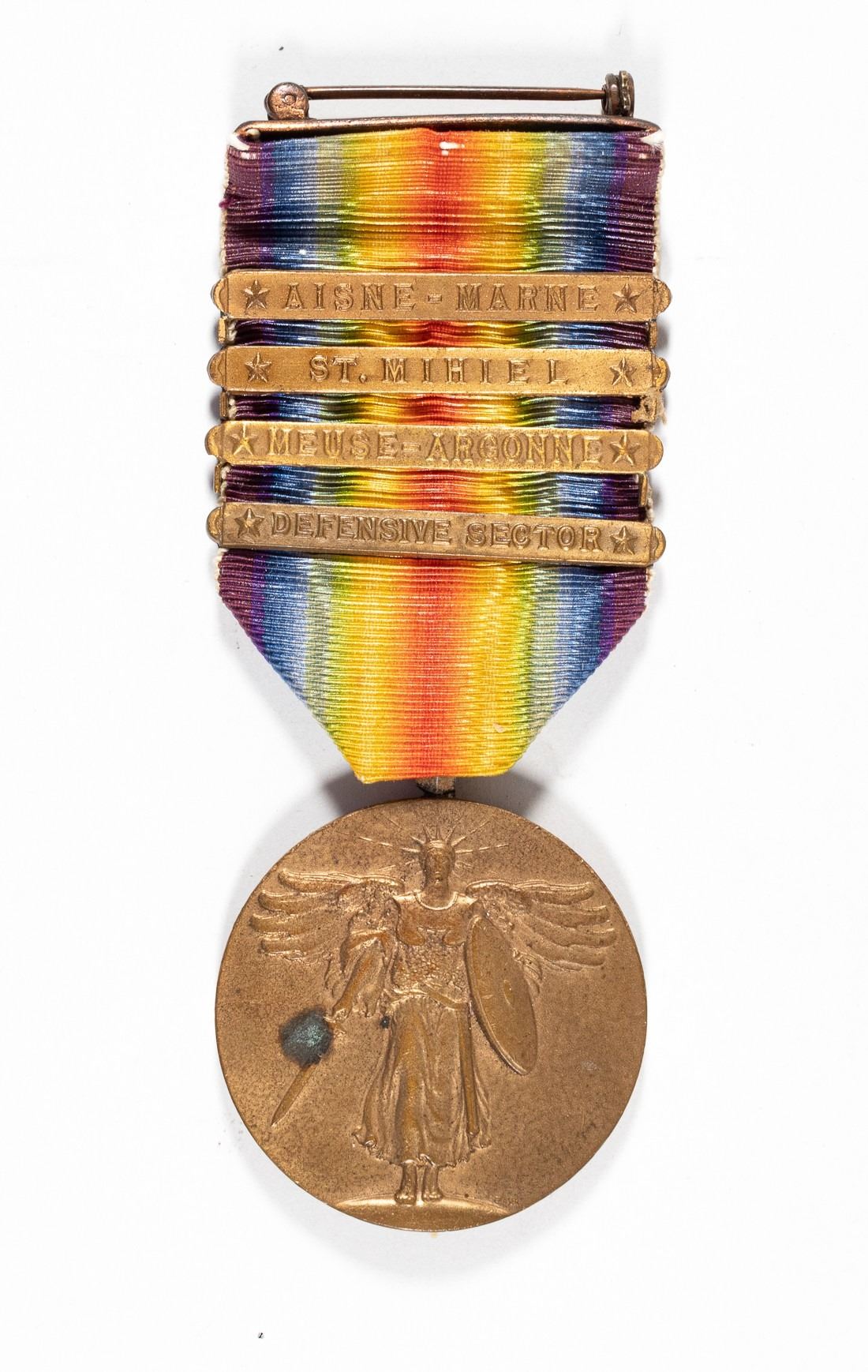 WWI United States Victory Medal with campaign bars for Aigne-Marne, St. Mihiel, Meuse-Argonne, and the Defensive Sector. Medal comes in damaged box with faded stamp of campaign locations.