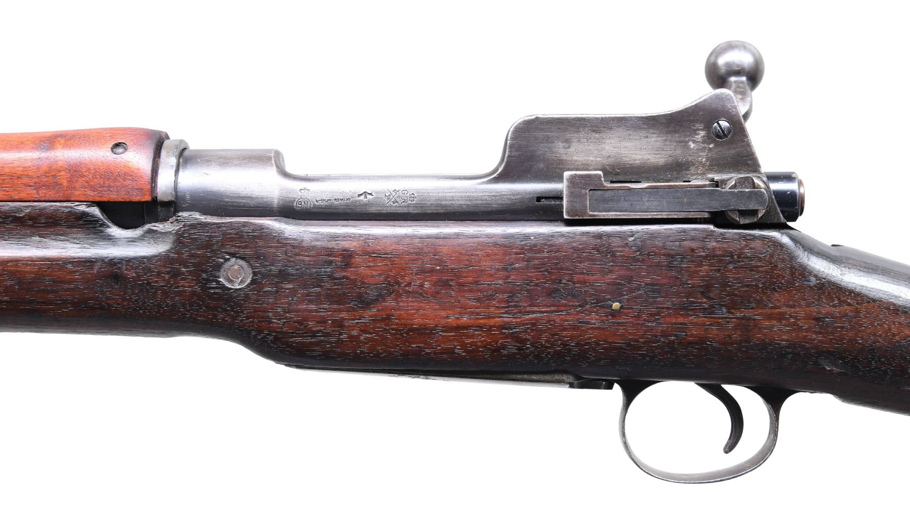 RIFLE. Cal. 303 British. S# W41717. Bbl. 26". Bbl. is unmarked. Ladder aperture rear sight graduated to 1,650 yards. Blade front sight w/ protective ears. Receiver ring is marked on top w/ encircled 5-pointed star. Receiver is marked on left rail w/ "crowned GR" view mark, "broad arrow" & the "crown" w/ encircled "BM" beside the words "NOT ENGLISH MANF". This is the commercial proof given to surplus rifles that were sold to civilians in Great Britain. The bolt handle shows grinding marks on top, indicating that the bolt is a replacement matched to the rifle. Bolt handle marked underneath "NS". Trigger guard is marked "DP" which means "drill purpose". Walnut stock w/ replacement hardwood handguards. Buttstock is marked on right side w/ "DP" & encircled "51 / broad arrow / 9-66". Original marking disc replaced by wood plug. Stock retains the range plate for the volley sight at the forend. Rear aperture is not present. Upper band marked "E" has hobbyist gunsmith replacement stacking swivel. Bayonet stud shows file marks. CONDITION: stock has moderate wear, staining & handling marks throughout. Handguard finishes do not match stock. Metal retains 50% of its original blue finish w/ thinning in wear. Trigger guard has notable pitting on floorplate which has been cleaned. Bore has lightly worn lands w/ frosted grooves. PROVENANCE: From the Lifelong Collection of George Staden S&W Member #3451. (25-21/RW). CURIO. $400-600.