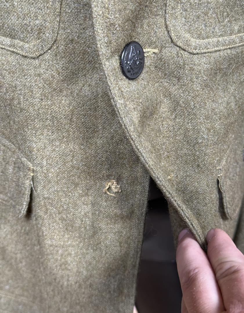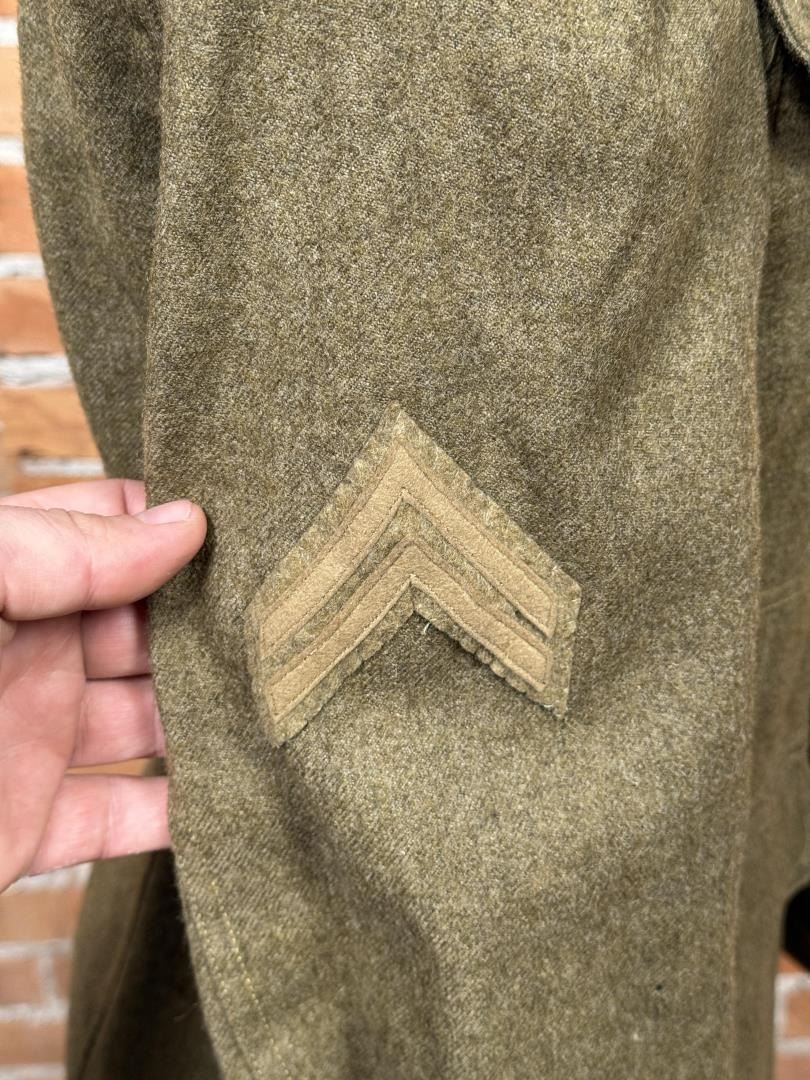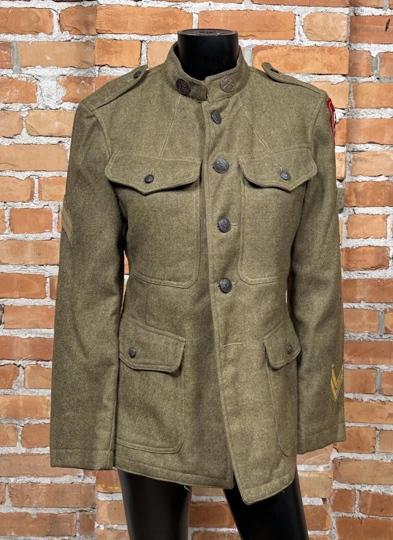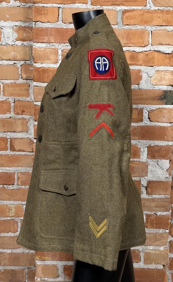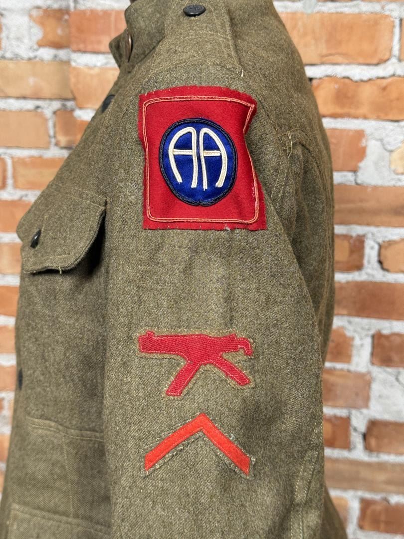 US Army Uniform Jacket. All American 82nd Infantry Division patch. Infantry Machine Gunner collar discs. 17" across the chest by 27" long.