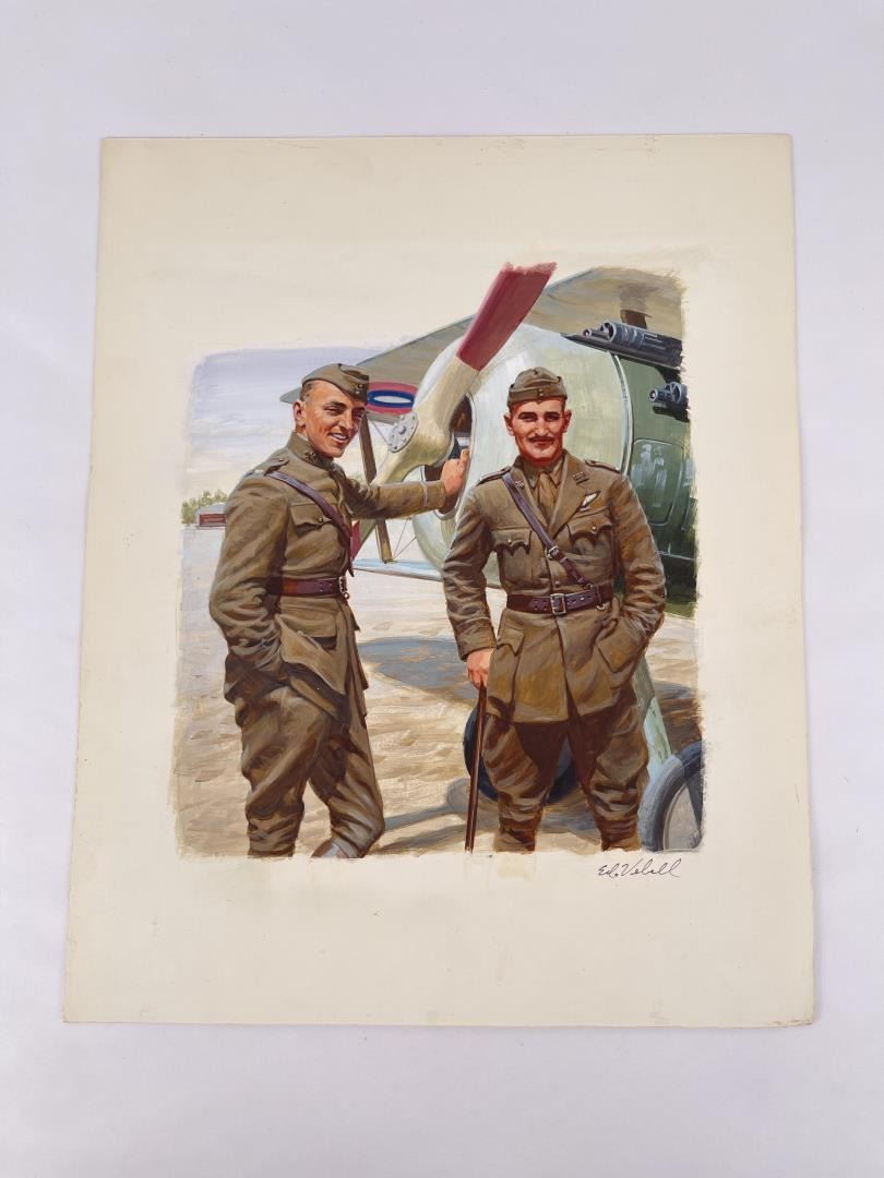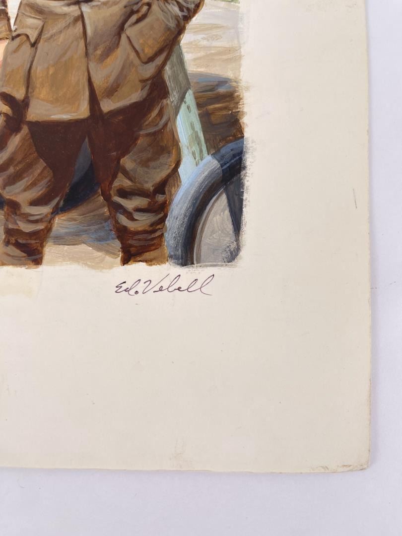 American Aces. 13" by 16 1/2". Edward T. Vebell (1921 - 2018) was active/lived in Illinois. Edward Vebell is known for Illustration, genre, historical painting. Vebell (1921- ) is an American illustrator, veteran, and Olympic athlete who attended the Chicago Institute of Art before enlisting. While serving in the Army, he was a contributing artist for Stars & Stripes magazine, working side by side with Bill Mauldin. His second major appointment was as courtroom artist for the Nuremburg Trials; his haunting portrait of Hermann Göring can be viewed at the United States Holocaust Memorial Museum in Washington D.C. Over the decades following the war, Vebell designed 16 circulated postage stamps for the US Postal Service, and enjoyed frequent commissions from Reader's Digest, Sports Illustrated, and Time.