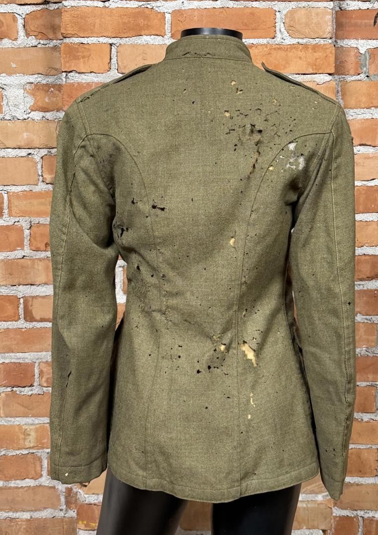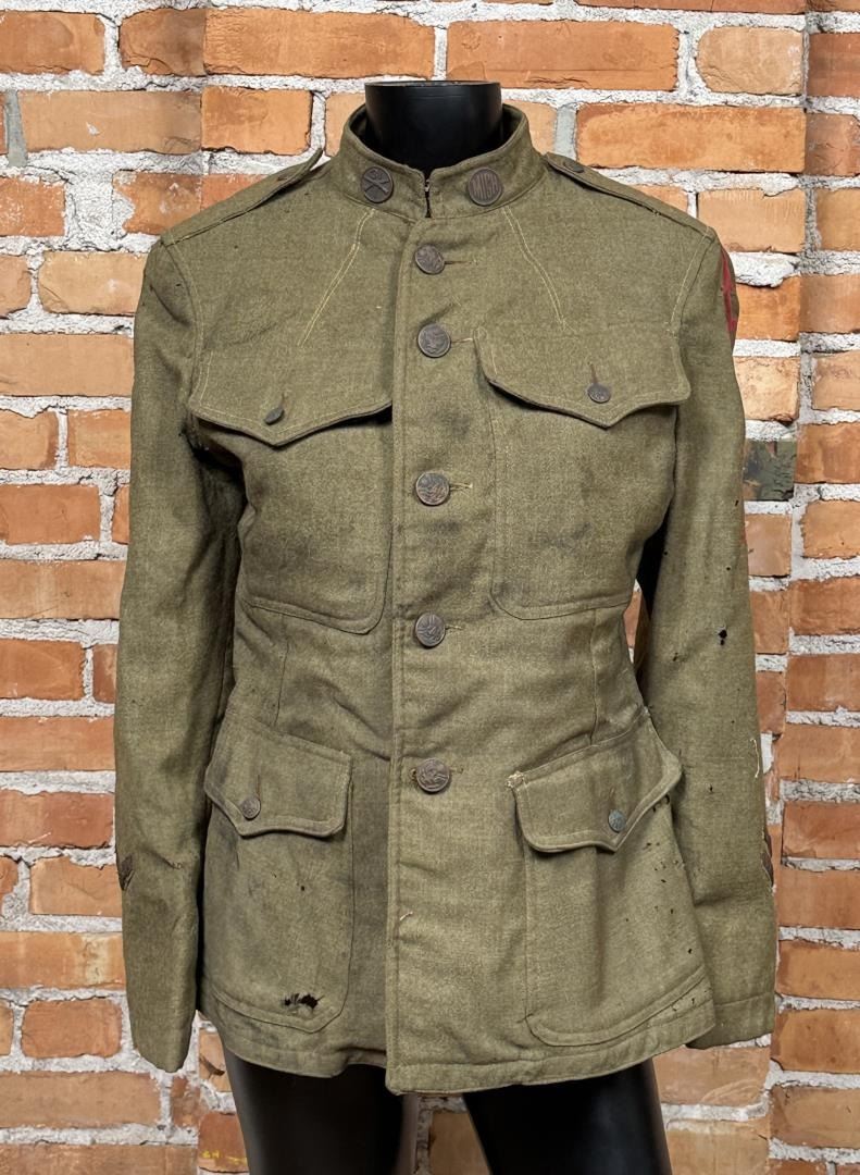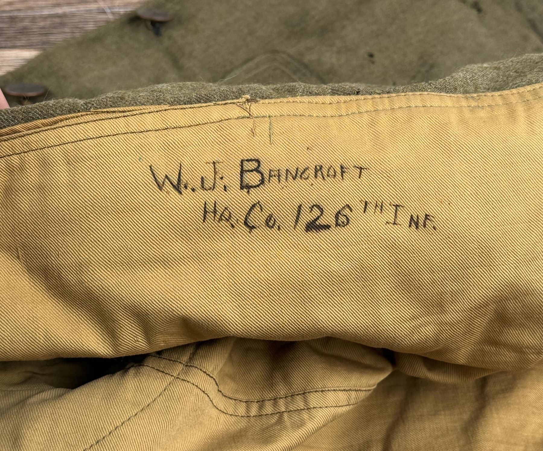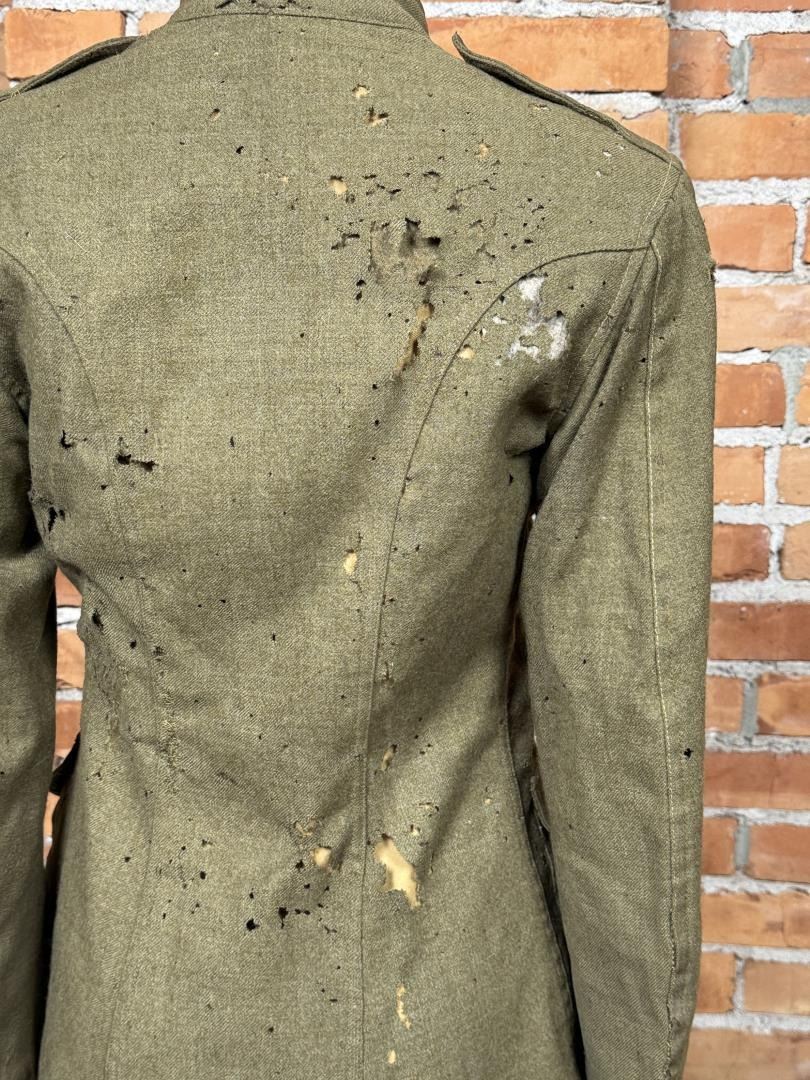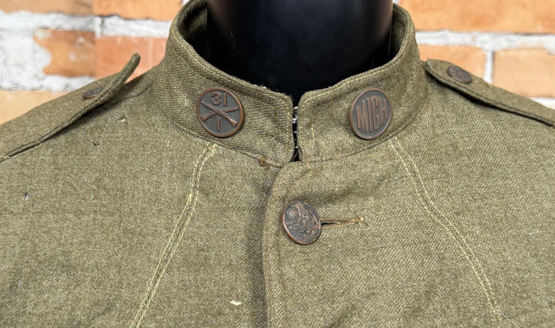 32nd Infantry patch. Michigan Infantry collar discs. Soldier named. 16" across the chest by 27" long. Extensive insect damage.