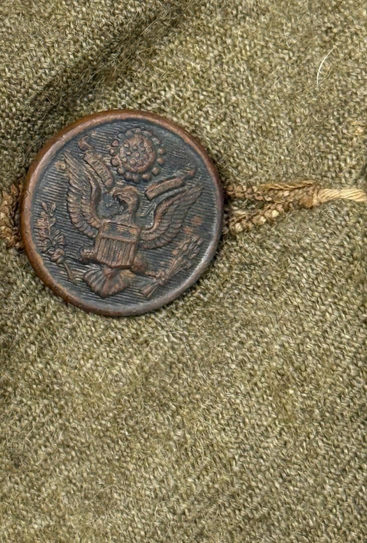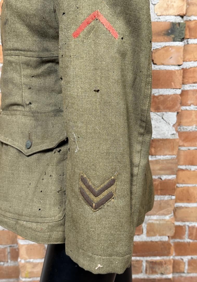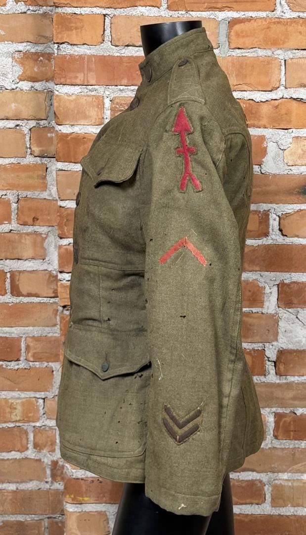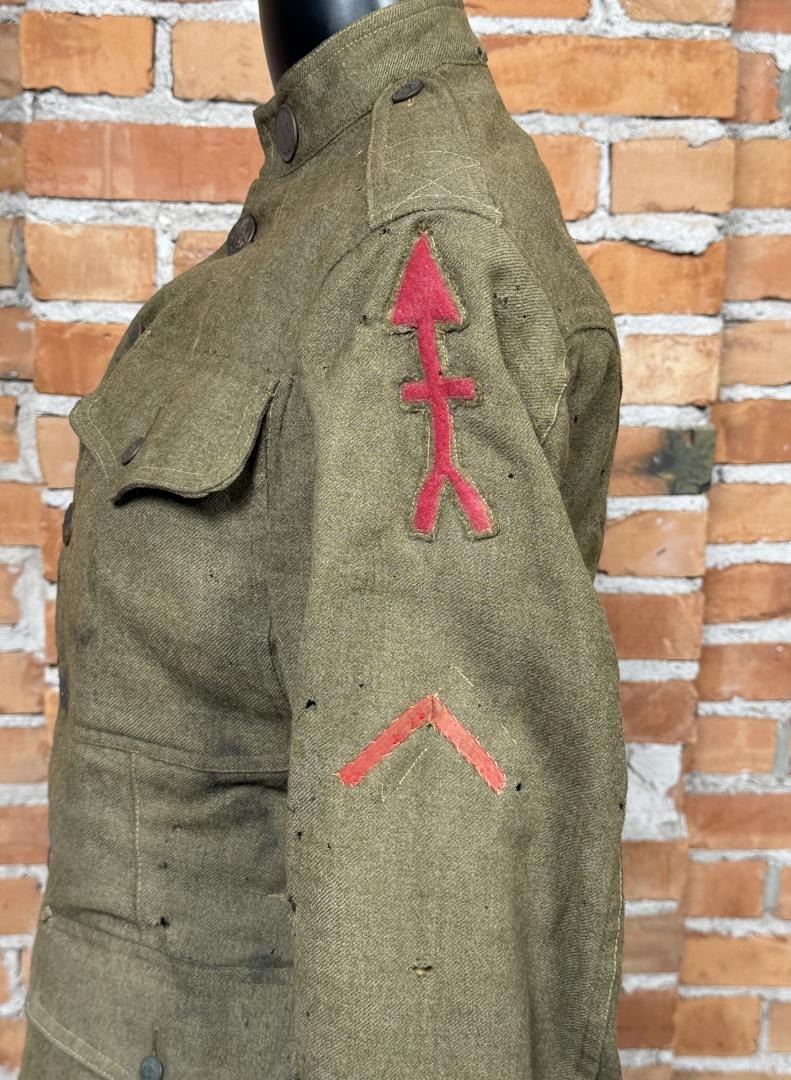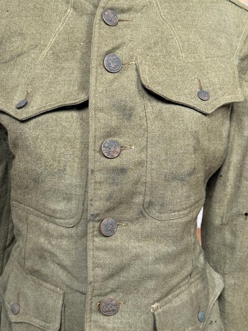 32nd Infantry patch. Michigan Infantry collar discs. Soldier named. 16" across the chest by 27" long. Extensive insect damage.