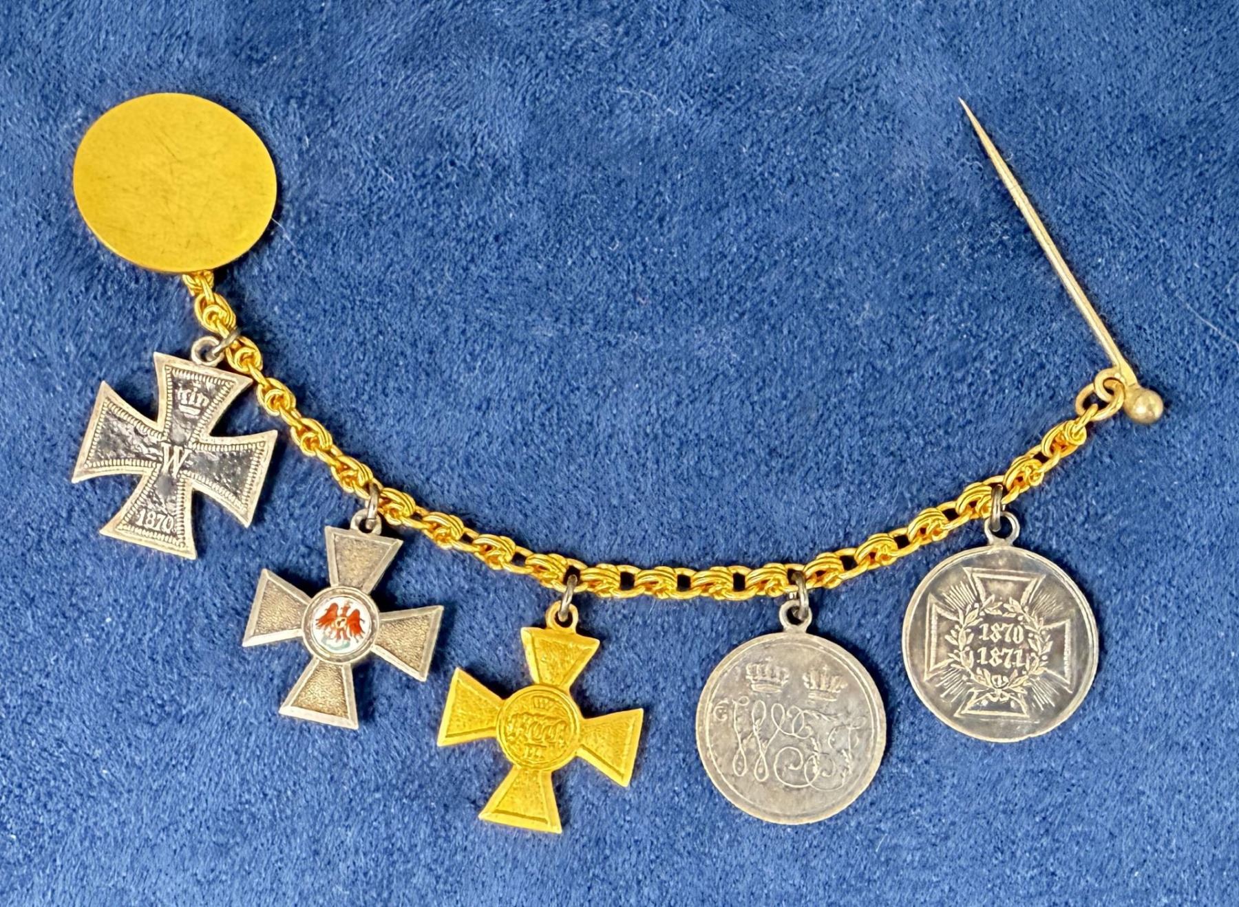 Nice grouping of medals on stick pin. 5 1/8" long.