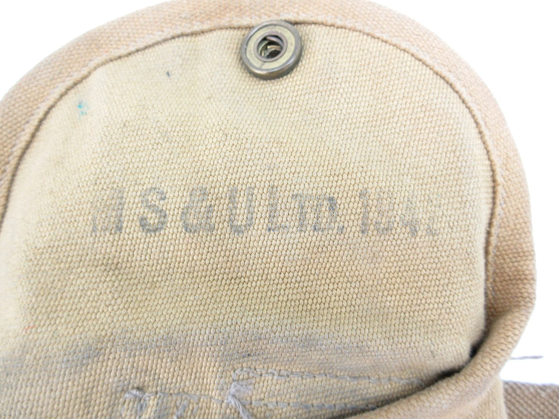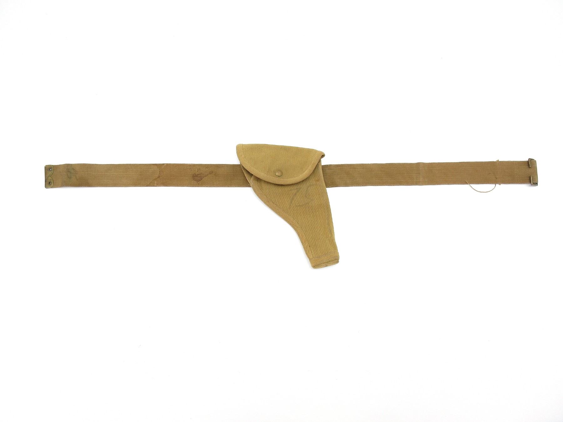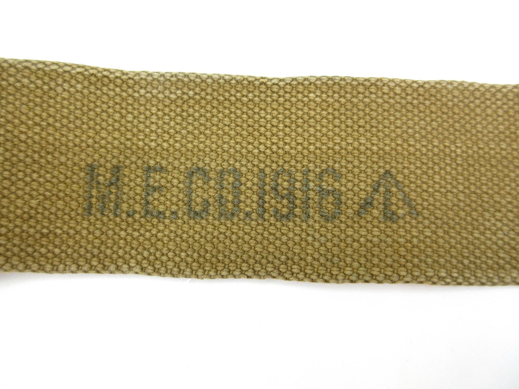 LOT INCLUDES; (1) TAN CANVAS BELT, MARKED: "M.E.CO. 1916" & BROAD ARROW, BRASS FITTINGS, OAL APPROX. 42" & (1) TAN P37 WEB CANVAS HOLSTER, FITS .455 WEBLEY AND S&W LARGE FRAME REVOLVERS, MARKED: "MS&U LTD. 1941", BRASS FITTINGS. SEE PHOTOS.