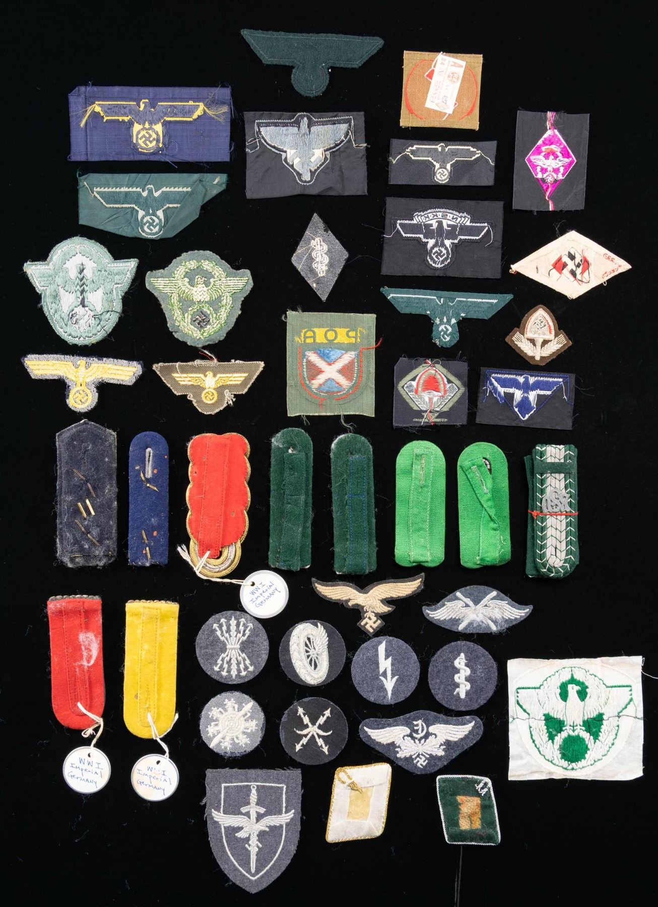 This large and extensive lot of WWI & WWII German cloth includes 1 Green on white Police sleeve patch. / 8 Luftwaffe specialty patches. / 1 Luftwaffe breast eagle. / 1 WWI Captain's shoulder strap. / 1 WWI Prussian 2nd Lieutenant's shoulder strap. / 1 Luftwaffe patch denoting female personnel serving on anti-aircraft crews. / 1 Collar tab for a Revierforester in the Luftwaffe Forestry Service. / 1 Collar tab for a DLV officer. / 1 Fire Police sleeve diamond. / 1 HJ sleeve diamond. / 1 NSFK breast eagle. / 1 Coast Artillery breast eagle. / 1 Army Panzer NCO breast eagle. / 2 Army breast eagles. / 1 HJ sleeve rune. / 1 NSKK breast eagle. / 1 SS cap eagle. / 2 Police sleeve eagles. / 1 POA foreign fighters sleeve patch. / 1 Navy breast eagle. / 1 Tropical Coast Artillery cap eagle. / 2 RAD cap insignia. / 1 TENO cap eagle. / 1 Sleeve insignia on black for a doctor. / 1 Pair of Meister of the Schutzpolizei shoulder straps. / 2 Different Customs shoulder straps. / 1 Shoulder strap for a Chief Boatswain. / 1 General officer's shoulder strap. / 1 Shoulder strap for a Captain of the medical corps. CONDITION: most items in this group show light wear but many are unissued. Please refer to photos for exact condition. (02-24878-8/BF). $1000-1400.