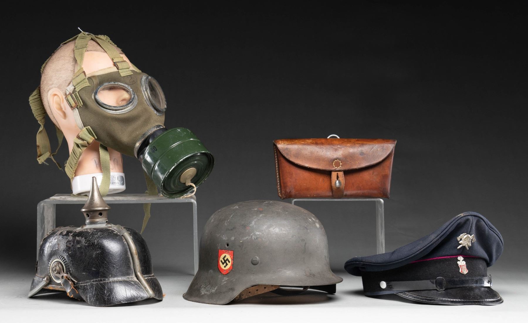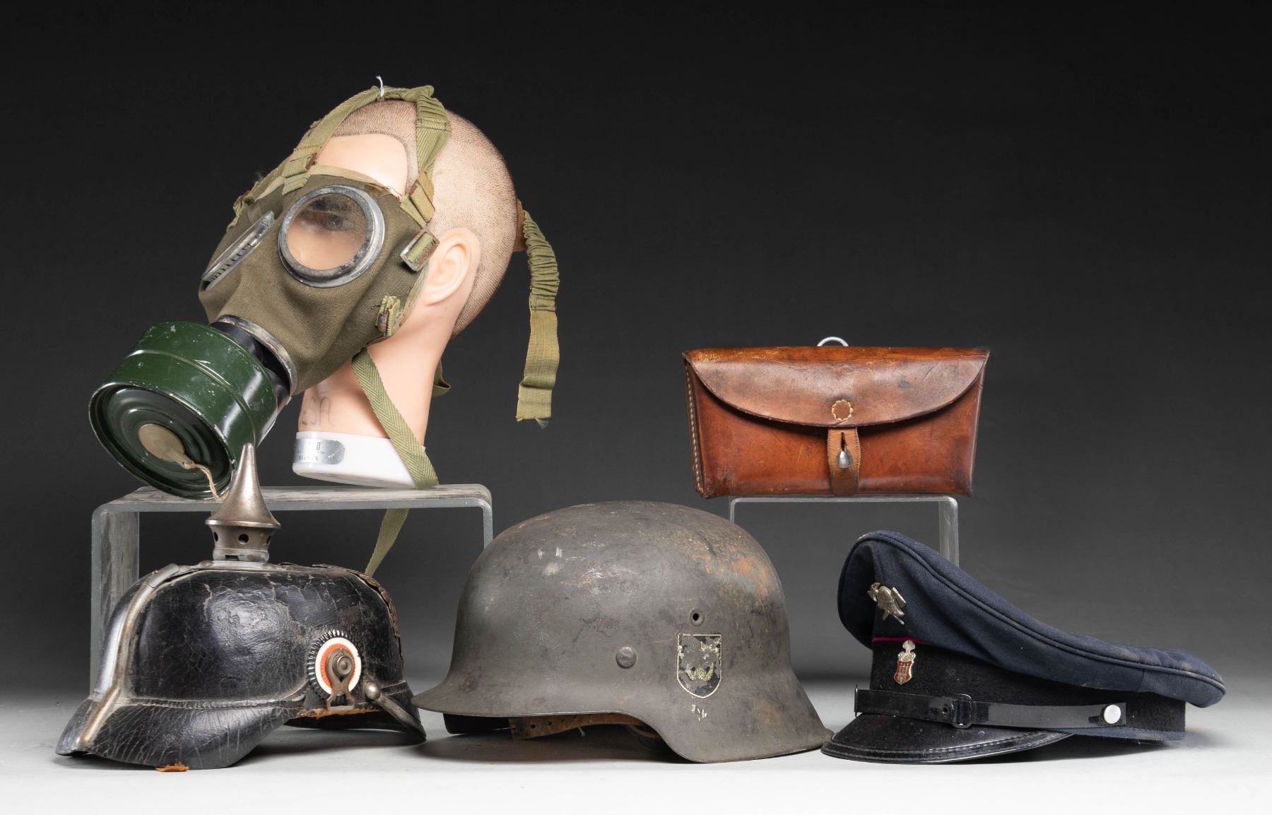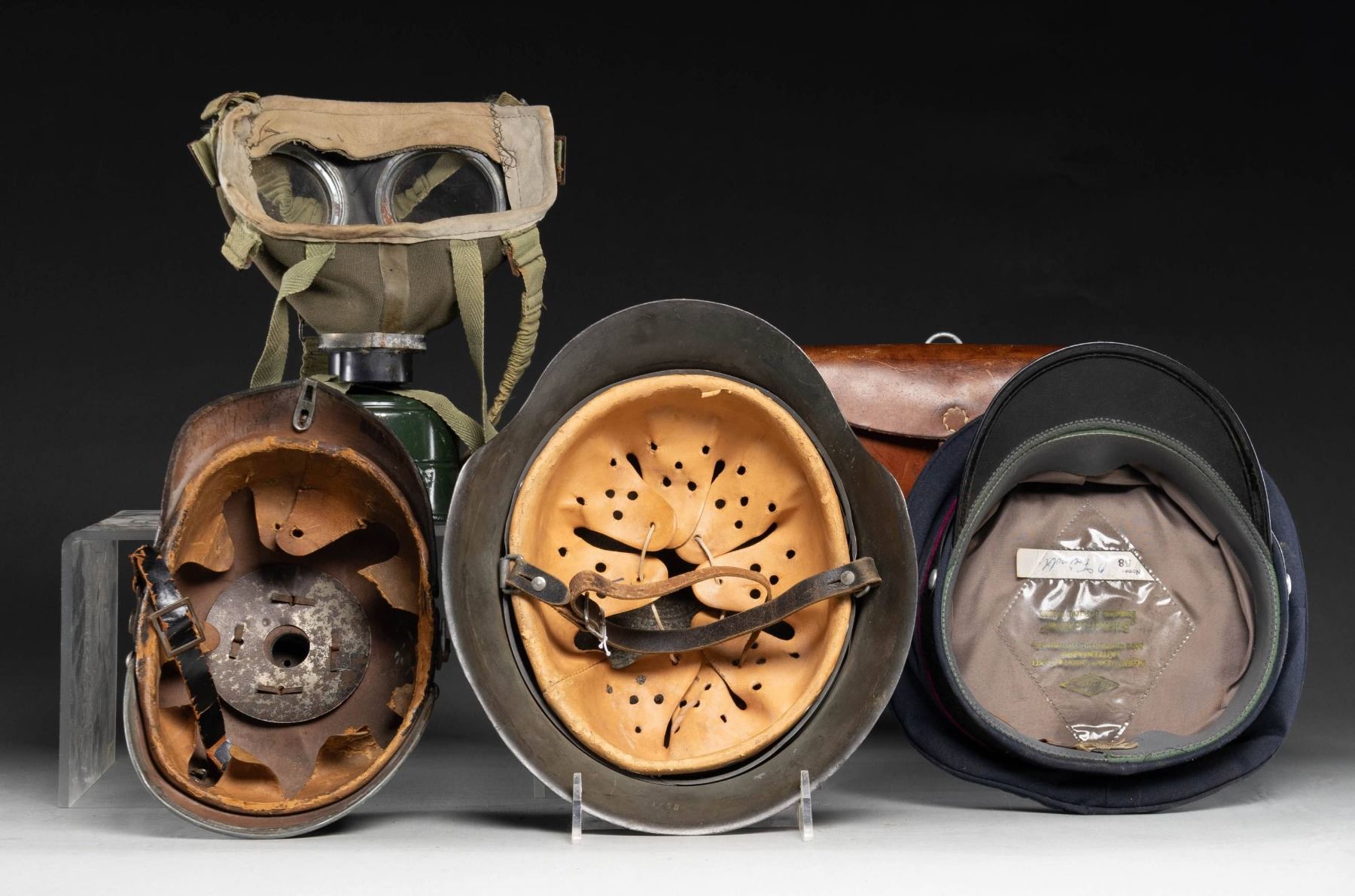 This varied lot includes 1 WWI era fire service visor cap from Odenburg in the Austro-Hungarian empire. / 1 WWI Prussian enlisted man's gray metal trimmed spike helmet with correct kokarden. / 1 WWII M1942 Police combat helmet. Helmet has a Police decal on the left side and a national decal on the right. Inner rear is stamped "0368" and the inner left side is stamped "E.F.68". Full liner and chinstrap. / 1 Gas mask with a green canvas body, dark green canister, and round eye lenses. / 3 WWII German "in memory of my service" testimonials measuring approximately 21 1/2" x 17". / 1 Swiss leather brown cartridge pouch stamped "E. REIMER BAZEHEID 66". CONDITION: all items generally show light wear. WWI spike helmet shows moderate wear and chinstrap is partially missing. WWII helmet has light wear but police decal is 40% and national decal is 90%. (02-24134/BF). NON-GUN. $600-900.