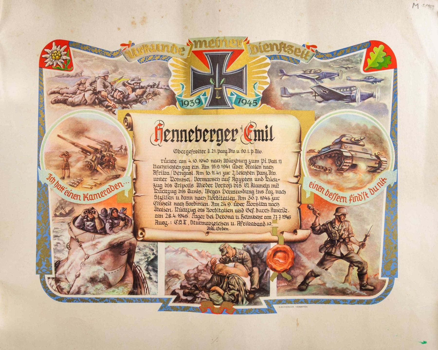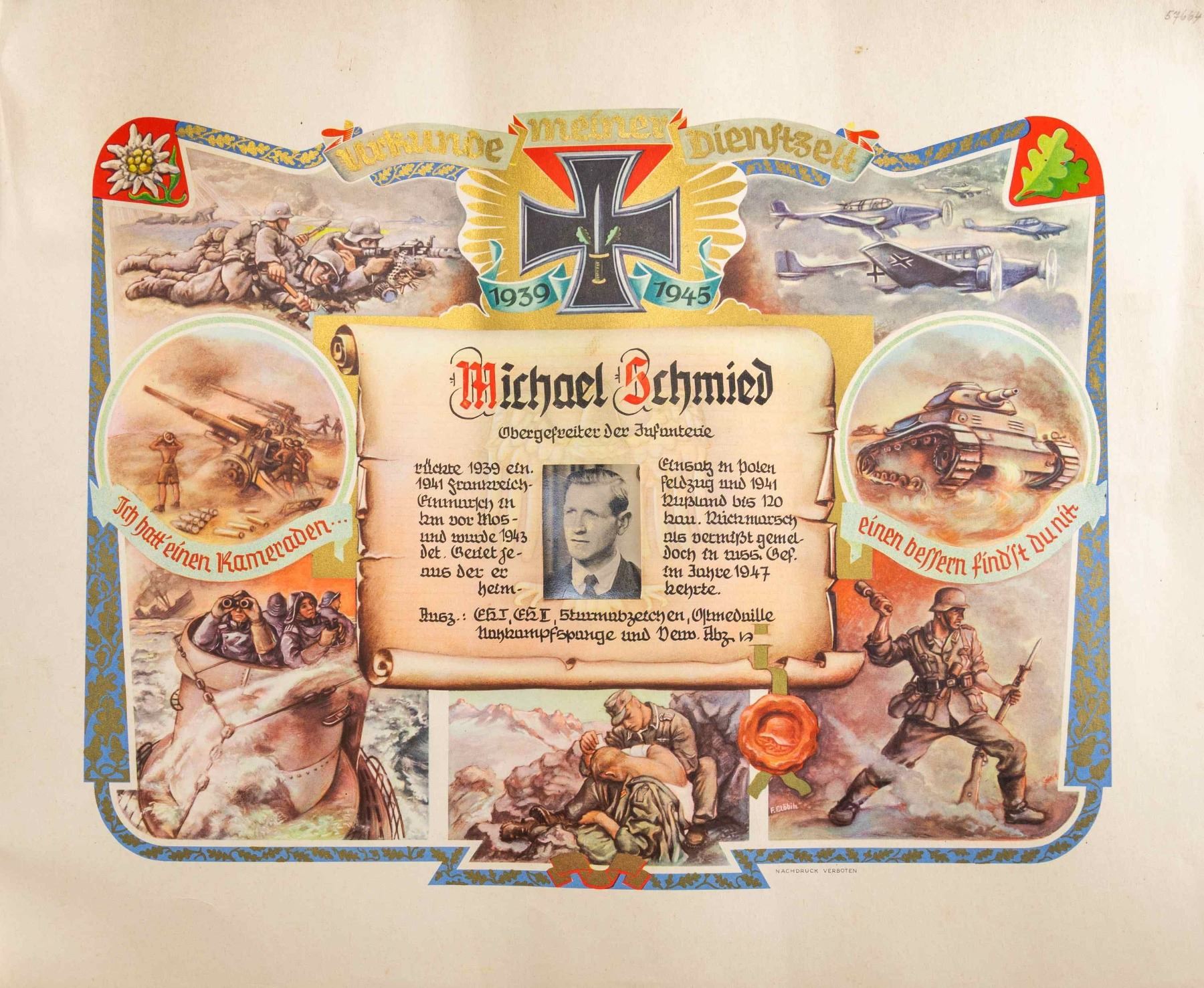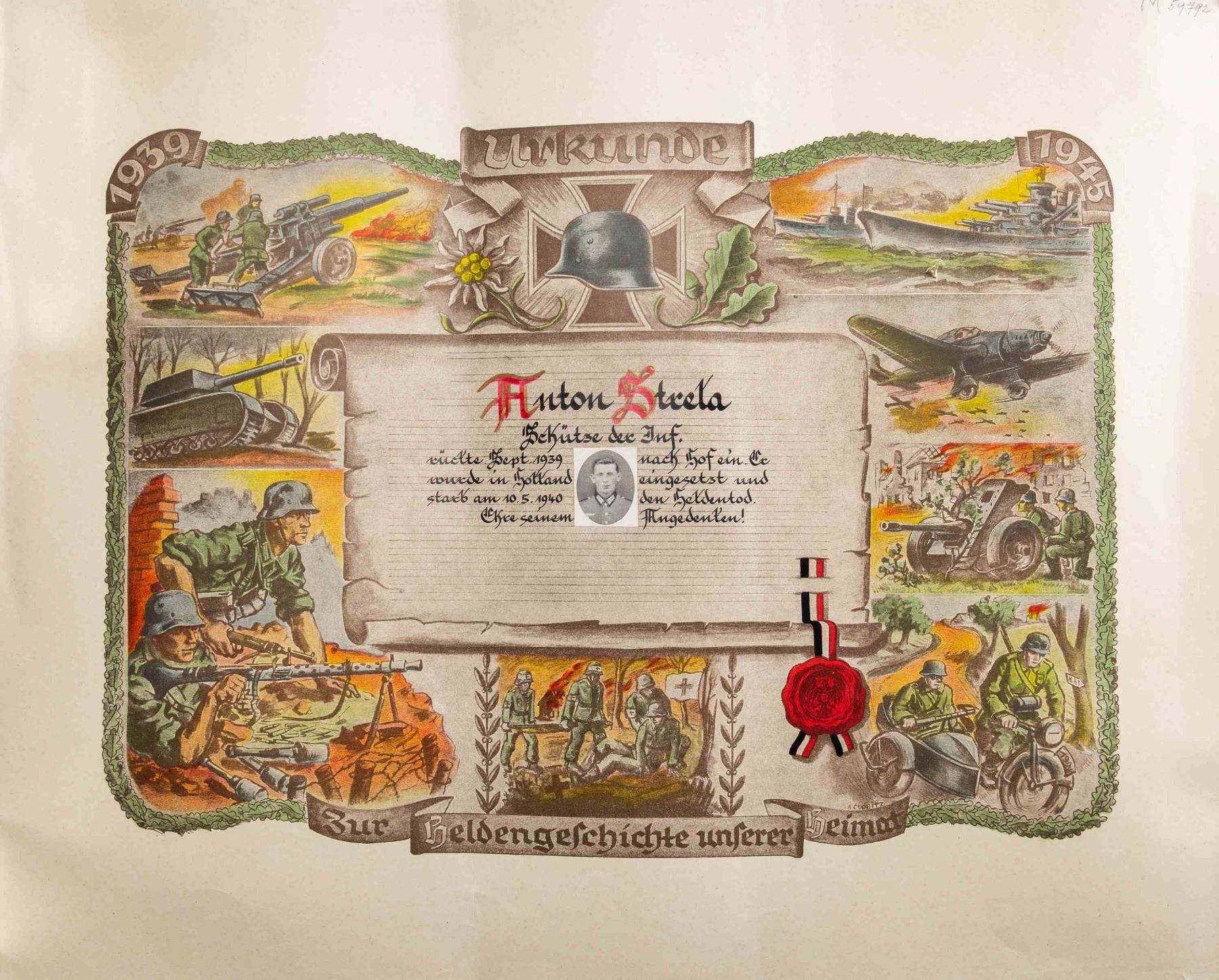 This varied lot includes 1 WWI era fire service visor cap from Odenburg in the Austro-Hungarian empire. / 1 WWI Prussian enlisted man's gray metal trimmed spike helmet with correct kokarden. / 1 WWII M1942 Police combat helmet. Helmet has a Police decal on the left side and a national decal on the right. Inner rear is stamped "0368" and the inner left side is stamped "E.F.68". Full liner and chinstrap. / 1 Gas mask with a green canvas body, dark green canister, and round eye lenses. / 3 WWII German "in memory of my service" testimonials measuring approximately 21 1/2" x 17". / 1 Swiss leather brown cartridge pouch stamped "E. REIMER BAZEHEID 66". CONDITION: all items generally show light wear. WWI spike helmet shows moderate wear and chinstrap is partially missing. WWII helmet has light wear but police decal is 40% and national decal is 90%. (02-24134/BF). NON-GUN. $600-900.