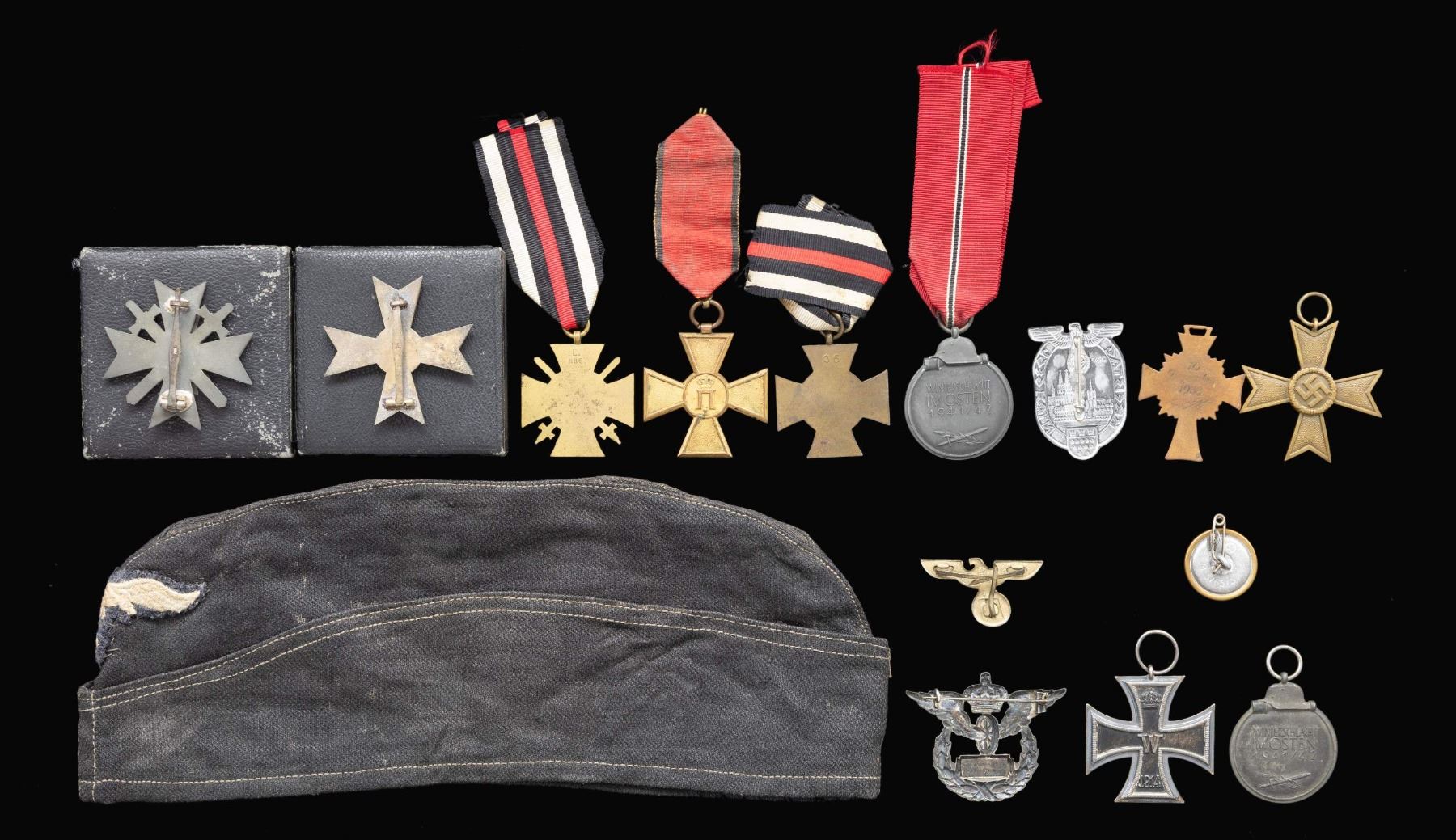 This lot of WWII German items includes 1 Russian Front medal with ribbon. / 1 Luftwaffe overseas cap in rayon lined cotton. / 1 War Merit Cross First Class without swords in original issue box. / 1 War Merit Cross First Class with swords on original issue box. Award has a gray zinc finish. / 2 WWI War Service Crosses with swords and ribbon. / 1 WWI Iron Cross Second Class without ribbon. / 1 Russian Front Medal without ribbon. / 1 WWII War Merit Cross without swords and no ribbon. / 1 Reichbahn 25 year service pin. / 1 Serbian 1913 Balkans War medal with ribbon. / 1 Damaged Bronze Mother's Cross with no ribbon. / 1 Koln tinnie of 1936. / 1 Eagle for a political leaders collar tab. / 1 Political leaders button. CONDITION: all items generally show light wear unless noted above. (02-24267-1/BF). NON-GUN. $400-700.