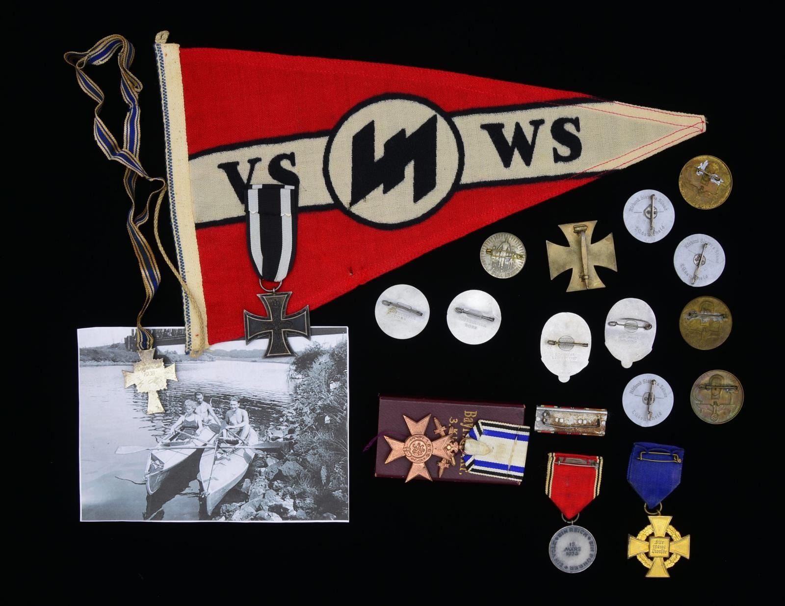 PENNANTS. This fine group includes a Hitler Youth Boating pennant in red, black & white. / WWII 1st Class Iron Cross. / WWI 2nd Class Iron Cross w/ ribbon. / Silver Mother’s Cross w/ ribbon. / WWI Bavarian Cross of Honor w/ swords including ribbon & issue box. / Ribbon bar featuring a 2nd Class Iron Cross, Russian Front medal & Western Front medal. / Anschluss medal w/ ribbon. / WWII 40 Year Faithful Service medal w/ ribbon. / Several May Day & Tag der Arbeit tinnies. / Kinder Aufs Land 1934 tinnie. CONDITION: all items show light wear. Mother’s Cross ribbon is a bit stained. (02-14161/BF). $600-900.