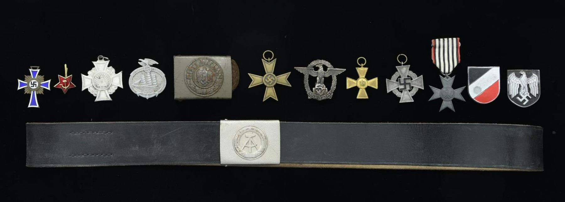 This lot consists of 1 WWI Prussian Merit Cross for War Aid with ribbon. / 1 Kyffhauserbund 1920s era Service Medal, no ribbon. / 1 WWI Prussian 15-Year Long Service Cross, no ribbon. / 1 WWII German War Merit Cross without swords & no ribbon. / 1 NSDAP 25-Year Faithful Service Medal. / 1 WWII German bronze Mother's Cross. / 1 WWII “SEEFAHRT IST NOT” tinnie. / 1 Pair of insignia for a WWII German pith helmet. / 1 WWII German Army enlisted man's buckle. / 1 East German belt & buckle. / 1 Russian star cap insignia. / 1 Small button with a crooked cross on it. / 1 Reproduction “ENGLAND AWAKE” Badge. / 1 Reproduction SS “FM” cufflink. CONDITION: items generally show light wear, unless noted otherwise. (02-21055/BF). $200-300.