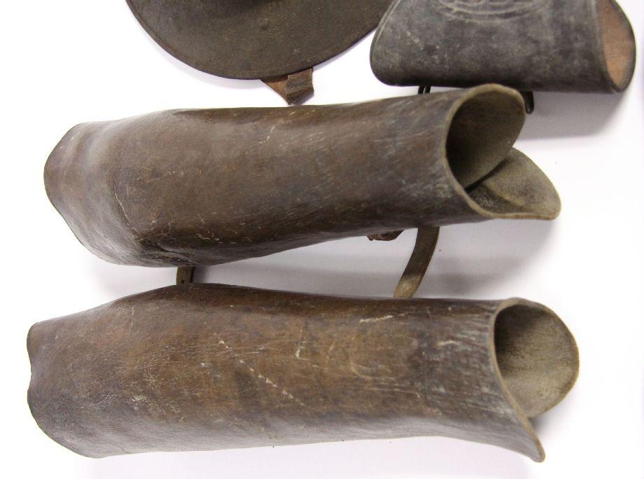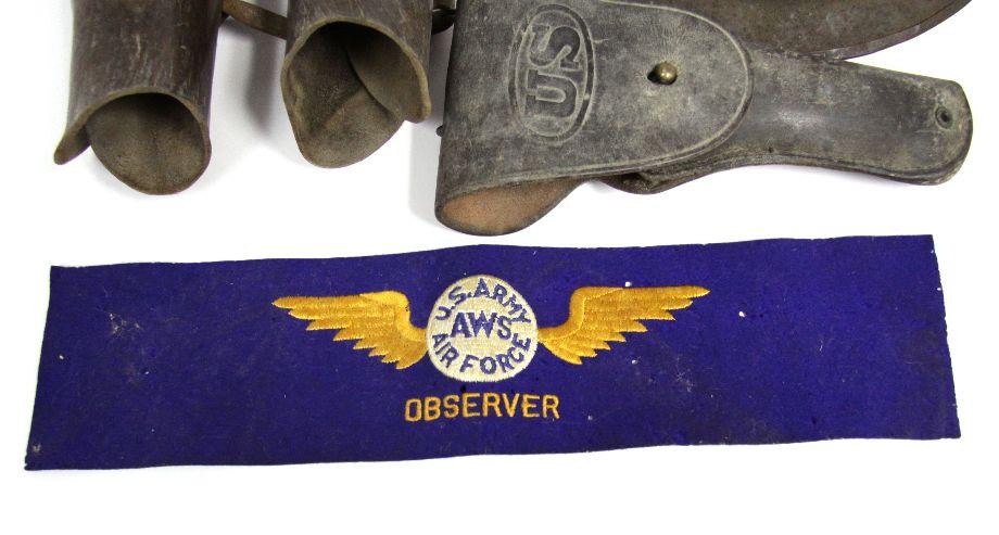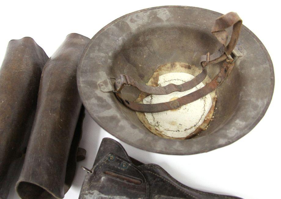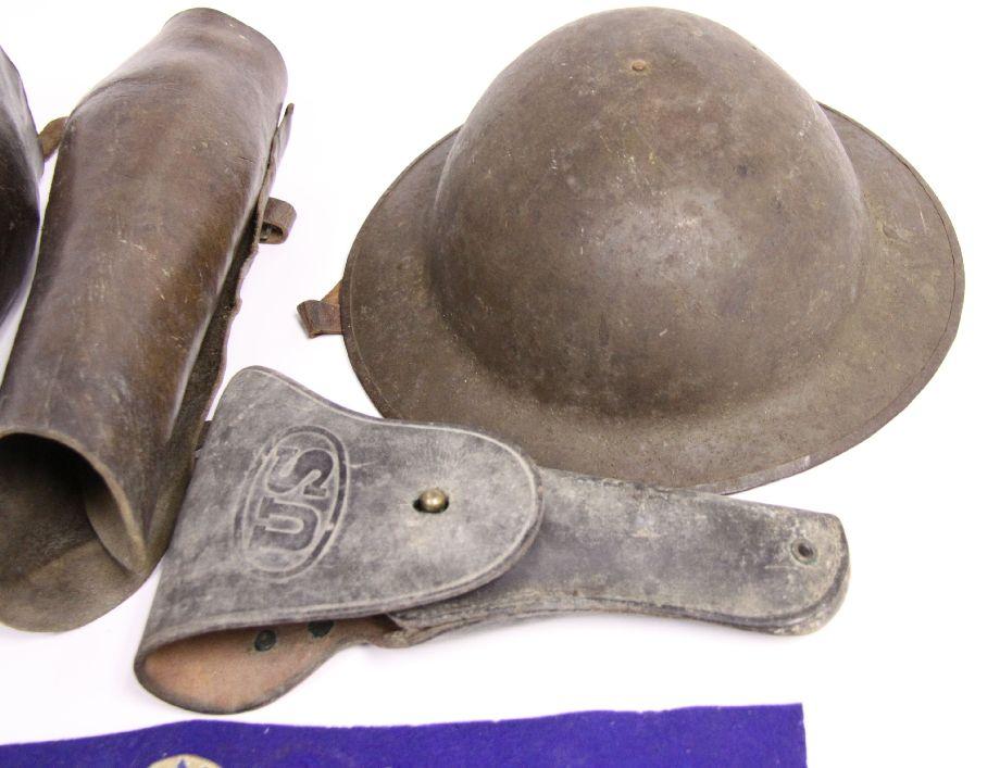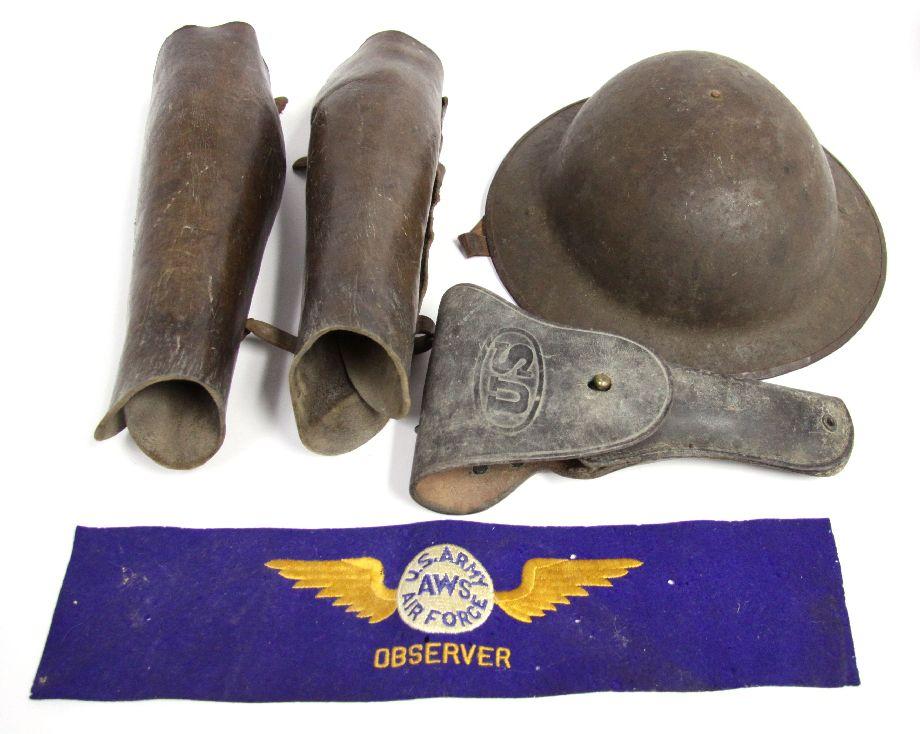 A multi war grouping consisting of a WWI Doughboy helmet with chin strap but no liner, an AWS WWI observer arm band (mothed), WWI leather leggings and a Boyt 1942 .45 holster in need of cleaning.