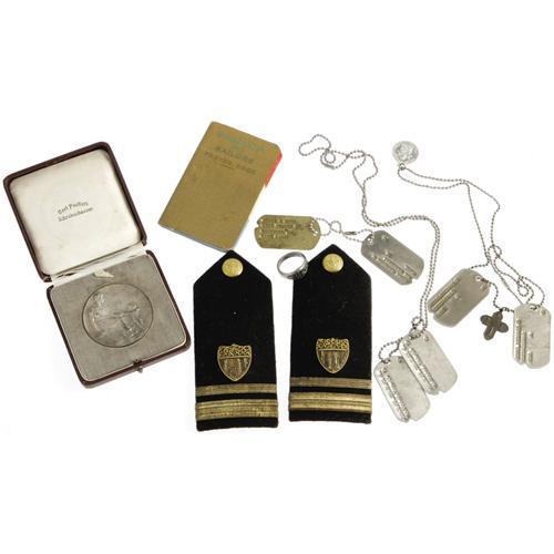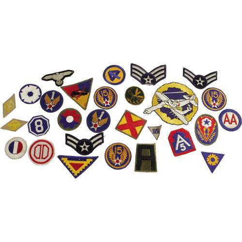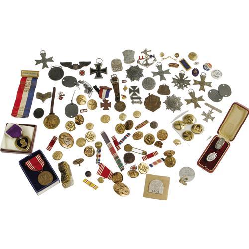 <B>Huge WWI & WWII Military Grouping.</B></I> A large, colorful and truly diverse accumulation of small military collectibles pertaining mostly to the First and Second World Wars. Approximately 200 items, some quite scarce, include the following: 20+ WWII shoulder patches representing various service branches, enlisted ranks and units; several dog tags; two USN officer's shoulder boards; a Purple Heart; two Marksman's medals; a WWI Iron Cross; a WWI Iron Cross finger ring; 1930s German workers' medals; U.S. army buttons and collar insignia; a Good Conduct medal; Four 1939 Wehrmacht service crosses; 2 Japanese insignia; a Union veteran reunion badge, and much, much more! A bonanza for the adventurous collector or the shrewd dealer. <BR><BR><B>Important noti