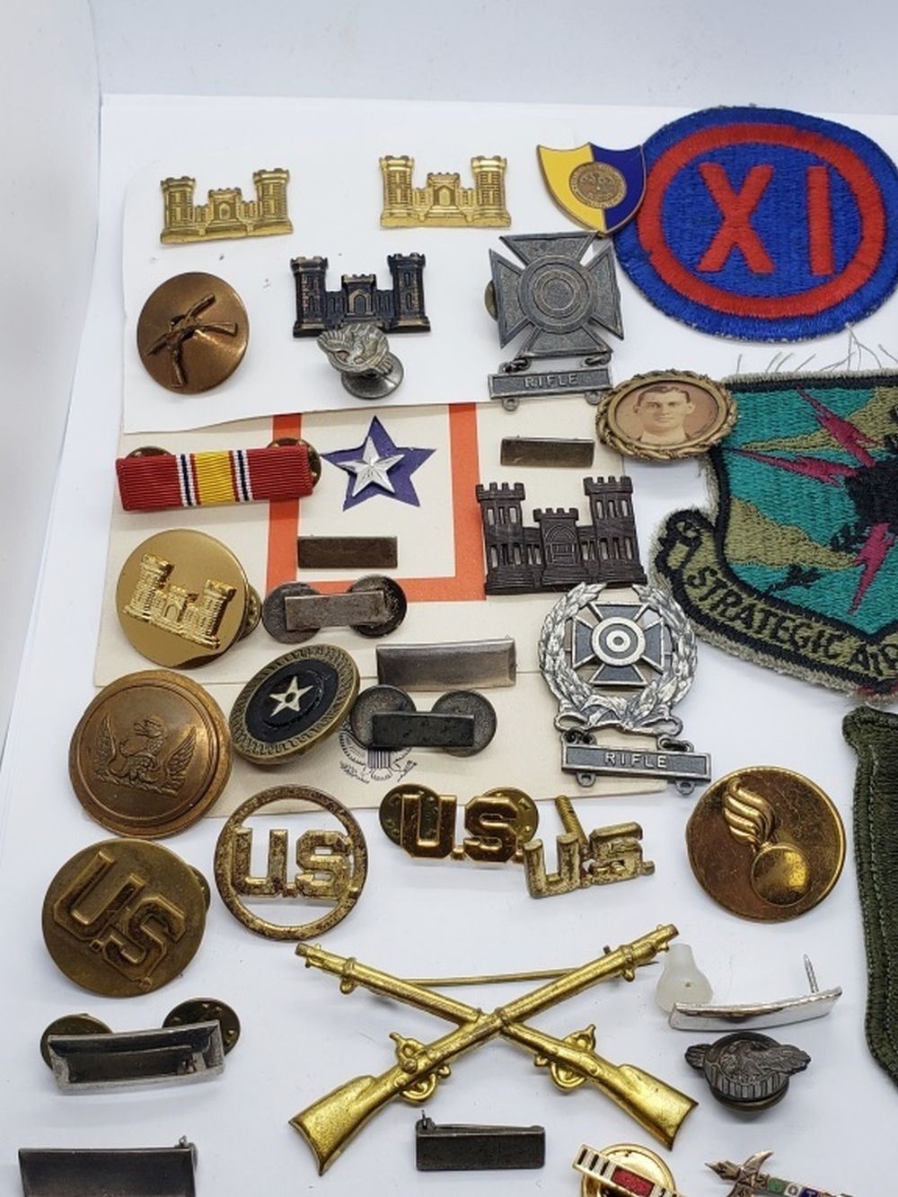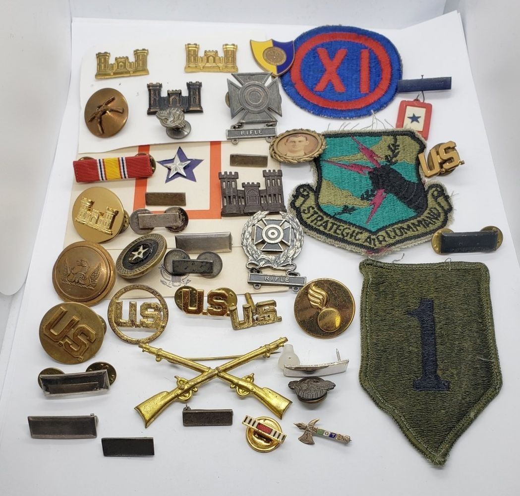 Sterling silver shooter badge & some LT Rank. Large Cross Rifles, a few buttons, disc insignia, patches,